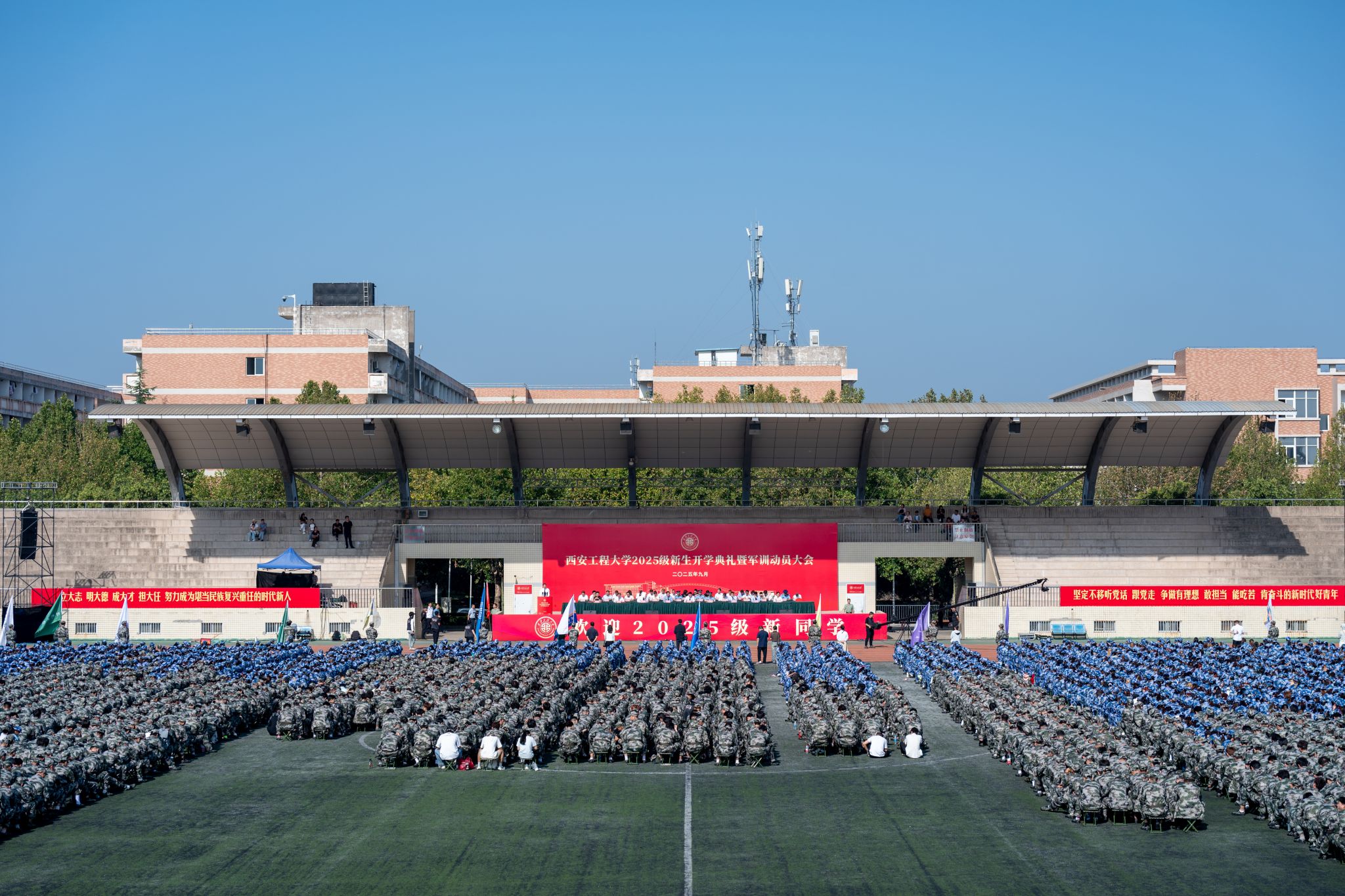 9月14日,beat365在临潼校区骊风体育场举行2025级新生军训总结表彰大会。校党委书记张志昌、校党委副书记井浩、副校长张洛红出席表彰大会。校国防教育暨学生军训领导小组各成员单位负责人、各学院党委书记、军训旅各团政委、军训办公室成员、全体承训教官、军训辅导员和4083名本科新生参加大会。军训旅依次进行连队队列歌曲展示和教官军体拳展示,同学们步伐铿锵、军容严整、口号震天,充分展现了新时代青年学子昂扬向上的精神风貌...