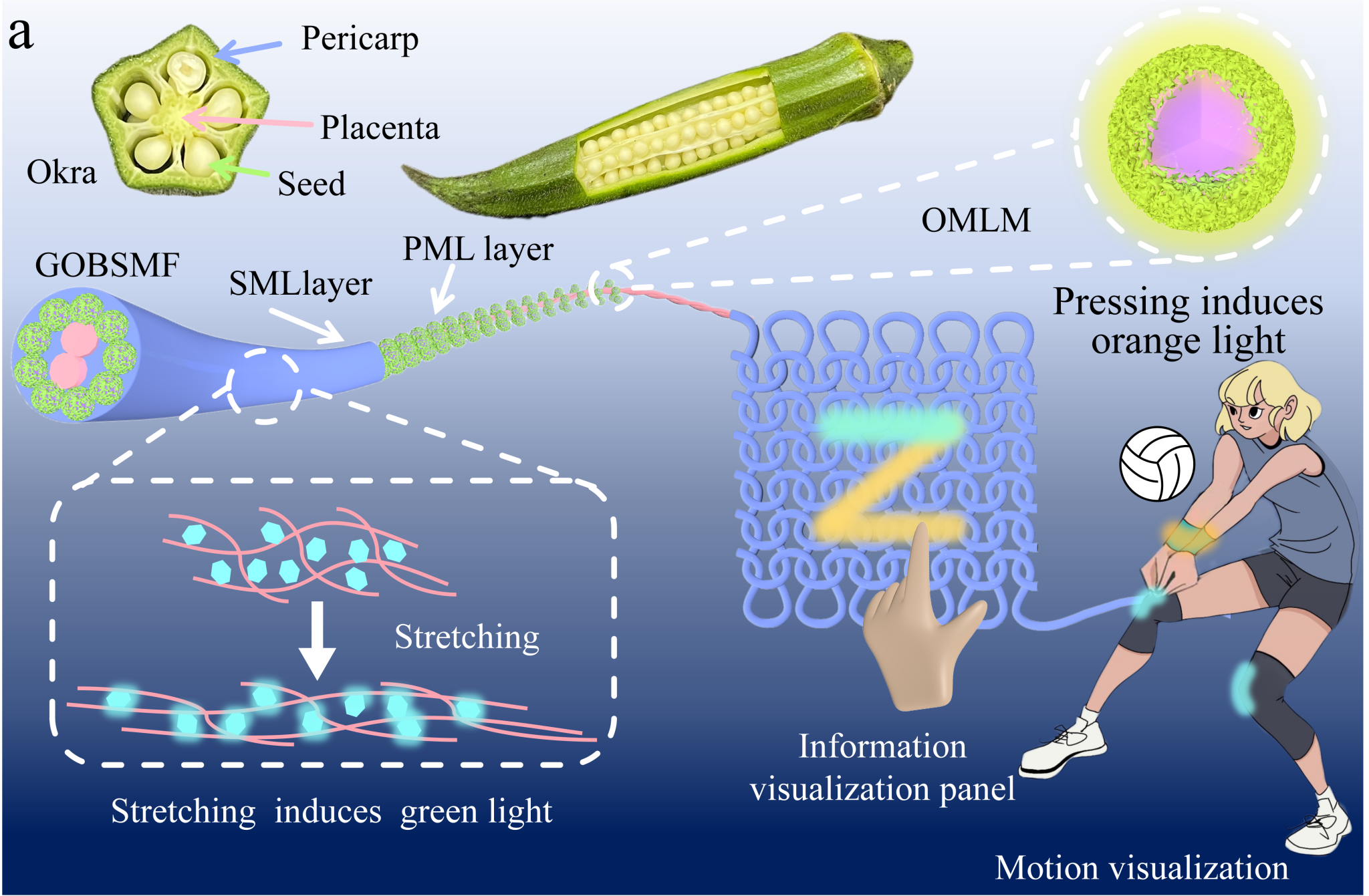 近日,beat365功能性纺织材料及制品教育部重点实验室樊威教授团队在材料领域顶刊Advanced Materials发表题为“用于视觉信号传输的仿秋葵结构绿-橙双色切换力致发光纤维”(Green-Orange Bi-color Switchable Mechanoluminescent Fiber of Okra-Like Structure for Visual Signaling)的研究论文。该研究受自然界中秋葵独特的多层结构启发,巧妙地模仿了秋葵的“胎座”“子房室”“种子”和“果皮”结构:以弹性PDMS纱线为柔性支撑...