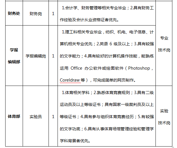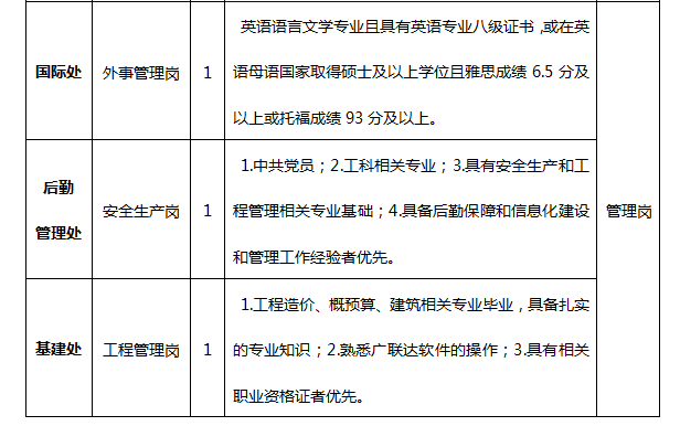 3.年龄要求:硕士年龄28周岁及以下(1991年5月后出生),博士研究生32周岁以下(1987年5月后出生)。应聘管理岗、专业技术岗、实验技术岗位者,如具有相关工作经验、岗位技能证书特别优秀者,年龄可适当放宽。