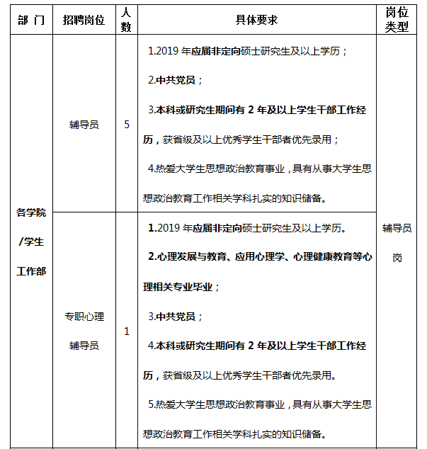 2.应聘者可同时报考辅导员岗位和管理(或专业技术、或实验技术)岗位,同时报考时需满足各岗位具体条件;但管理、专业技术、实验技术岗位仅可选择一个招聘岗位进行报考。