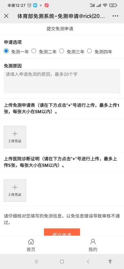 3、上传体育部官网下载的“体测免测申请表”图片,不超过5M。
