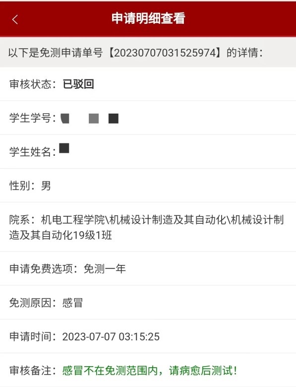 审核状态有通过和已驳回两种,如在免测范围内个人提交的材料有误或不合规范被驳回后可根据审批意见自行修改后重新提交申请。如因感冒或不严重的扭伤等可在一个月内康复的情况申请的免测不予通过,可在痊愈后联系测试教师补测。
