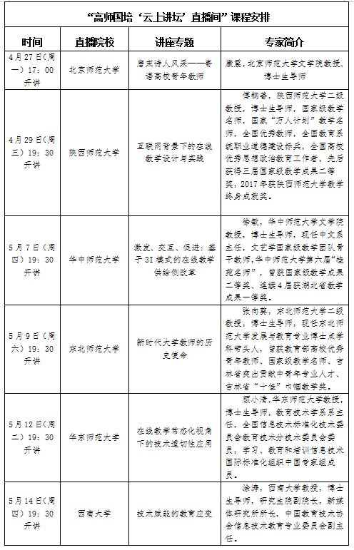 为助力高校教师信息化素养及教学能力提升,为疫情后线上线下混合式教学的常态化开展奠定基础,积极迎接高校复学。北京师范大学联合五所部属师范大学、地方高校及师范大学,开展“高师国培‘云上讲坛’直播间”(第一季)公益讲座活动,以网络直播形式提供免费培训课程。现组织beat365教师进行观看,具体课程安排如下: