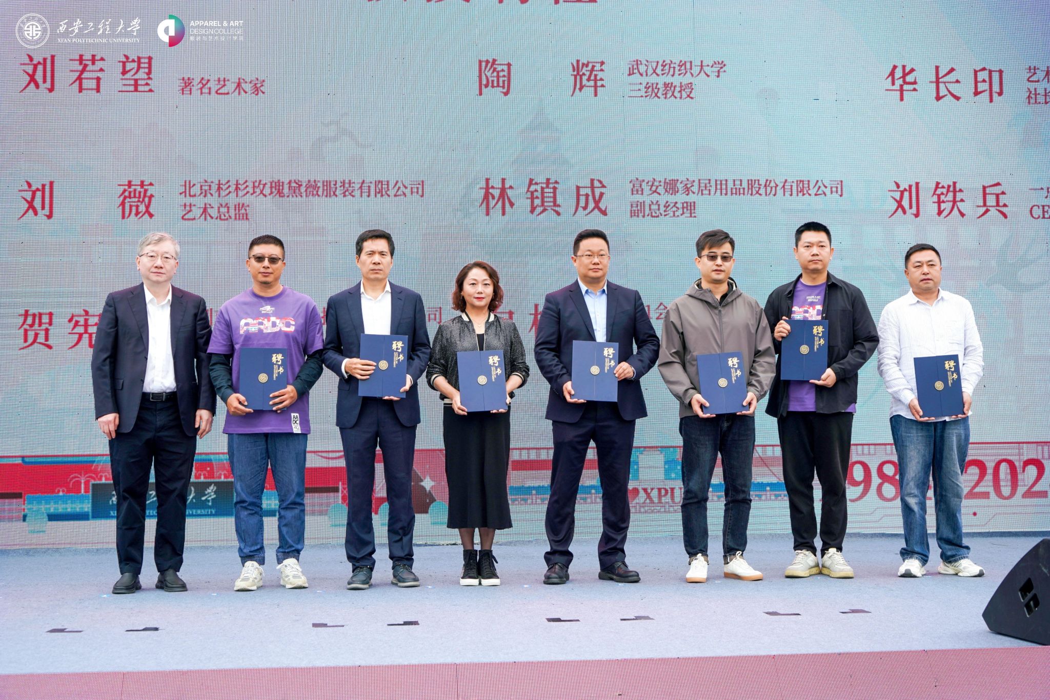会上,副校长朱永民为叶菲校友等及企业代表颁发捐赠证书;副校长戴鸿为著名设计师韩家英和刘薇、著名艺术家刘若望、武汉纺织大学教授陶辉等10人颁发客座教授聘书;副校长夏蔡娟、张洛红为富安娜集团副总裁杨彬、意尔康股份有限公司研发副总经理李海章、影儿时尚集团华中分区总经理何曦等20人颁发行业导师聘书;服装学院副院长袁燕与安踏体育用品有限公司、凌迪数字科技有限公司、深圳博克时代科技开发有限公司等10个院企合作基地签约。