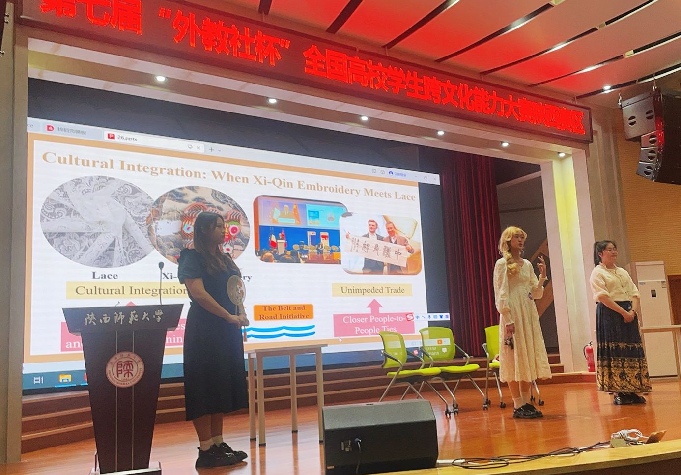 学校高度重视,由人文学院负责参赛准备工作,并先后完成宣传动员、校内选拔、选题打磨、理论辅导及演练等环节。在复赛中,团队成员结合学校特色,选取“西秦刺绣与蕾丝”为跨文化冲突案例,以生动语言和靓丽妆扮进行精彩演绎,深入分析了其所蕴含的跨文化知识和理论,并准确回答了评委提问,最终取得优秀成绩。