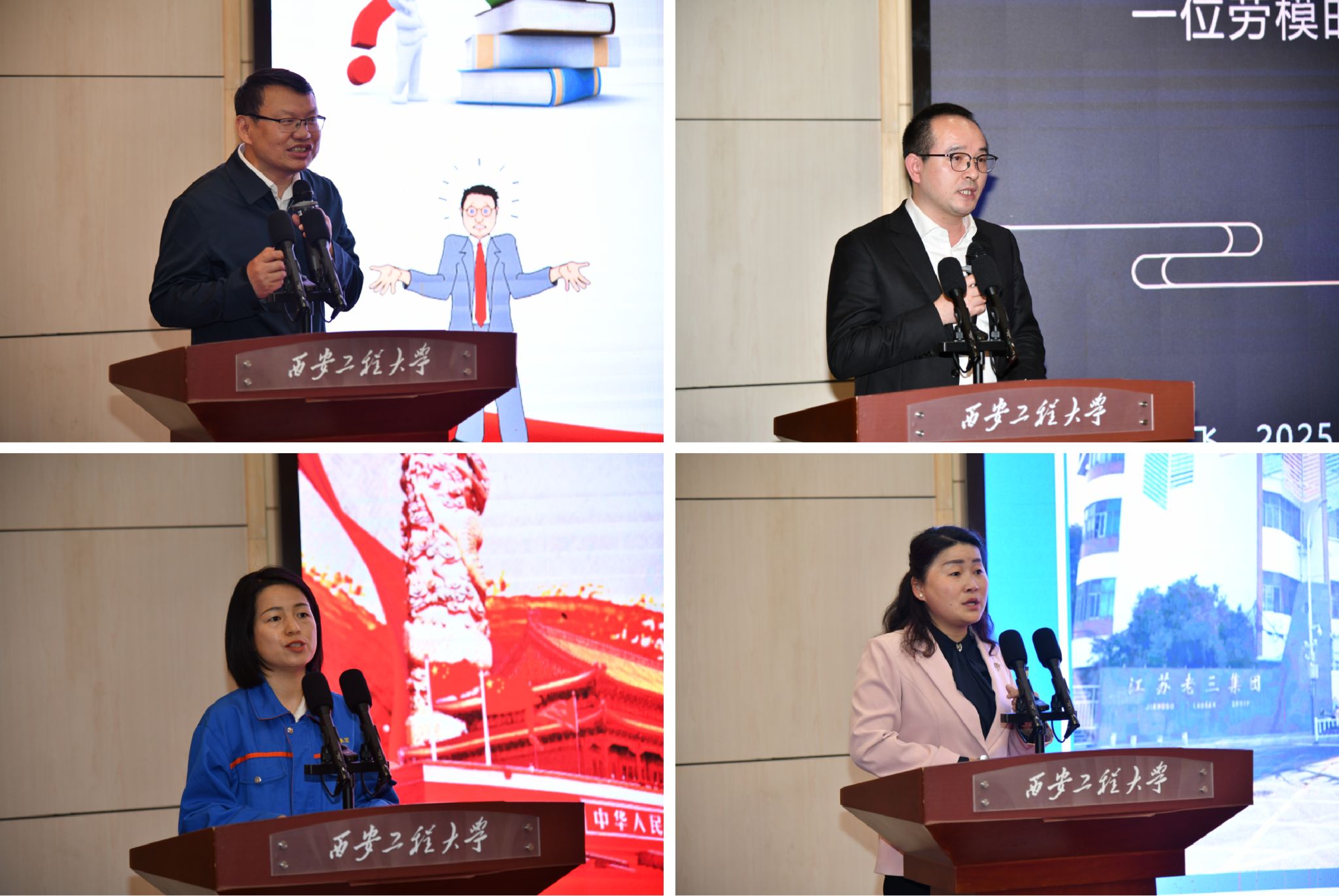 全国劳动模范、大国工匠培育对象邓建军,大国工匠培育对象、全国五一劳动奖章获得者雍飞,全国劳动模范何菲,全国劳动模范、全国三八红旗手李承霞四位国家级劳模工匠分别围绕自身成长经历和行业奋斗故事作报告。邓建军以“创新引领未来 争当知识型技能型创新型人才”为题,讲述了科技创新引领行业突破的探索之路;雍飞回顾了其从传统裁缝技艺传承者到时尚定制行业领军人物的成长历程;何菲以“梦桃精神 代代相传”为主题,分享了其作为赵梦桃小组第十三任组长在新时代传承梦桃精神的感人事迹;李承霞以“劳动创造幸福 奋斗织就梦想”为题,用一线岗位上的亲身实践诠释了新时代劳动者的担当与追求。劳模们质朴的话语、动人的故事引发在场师生强烈共鸣,会场掌声不断。