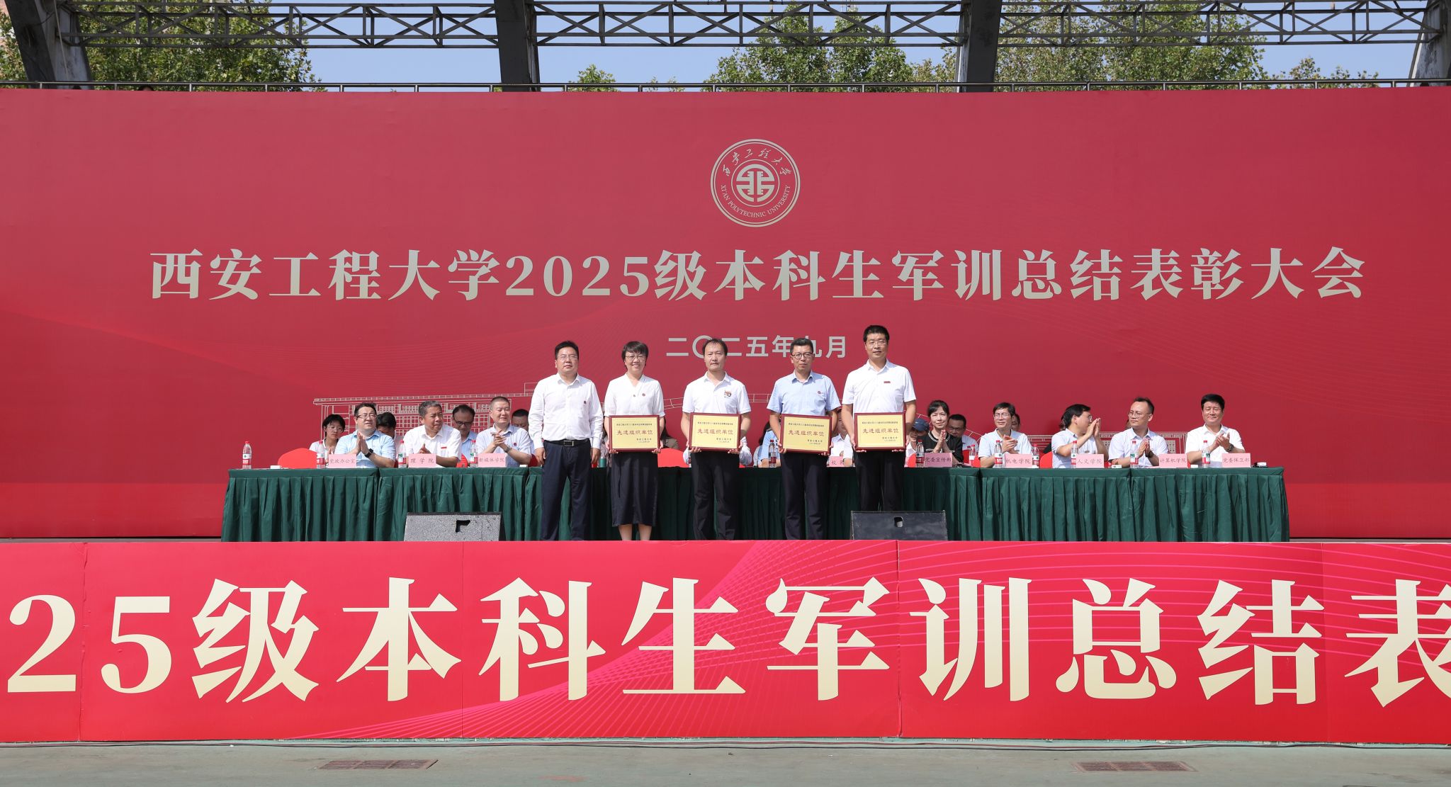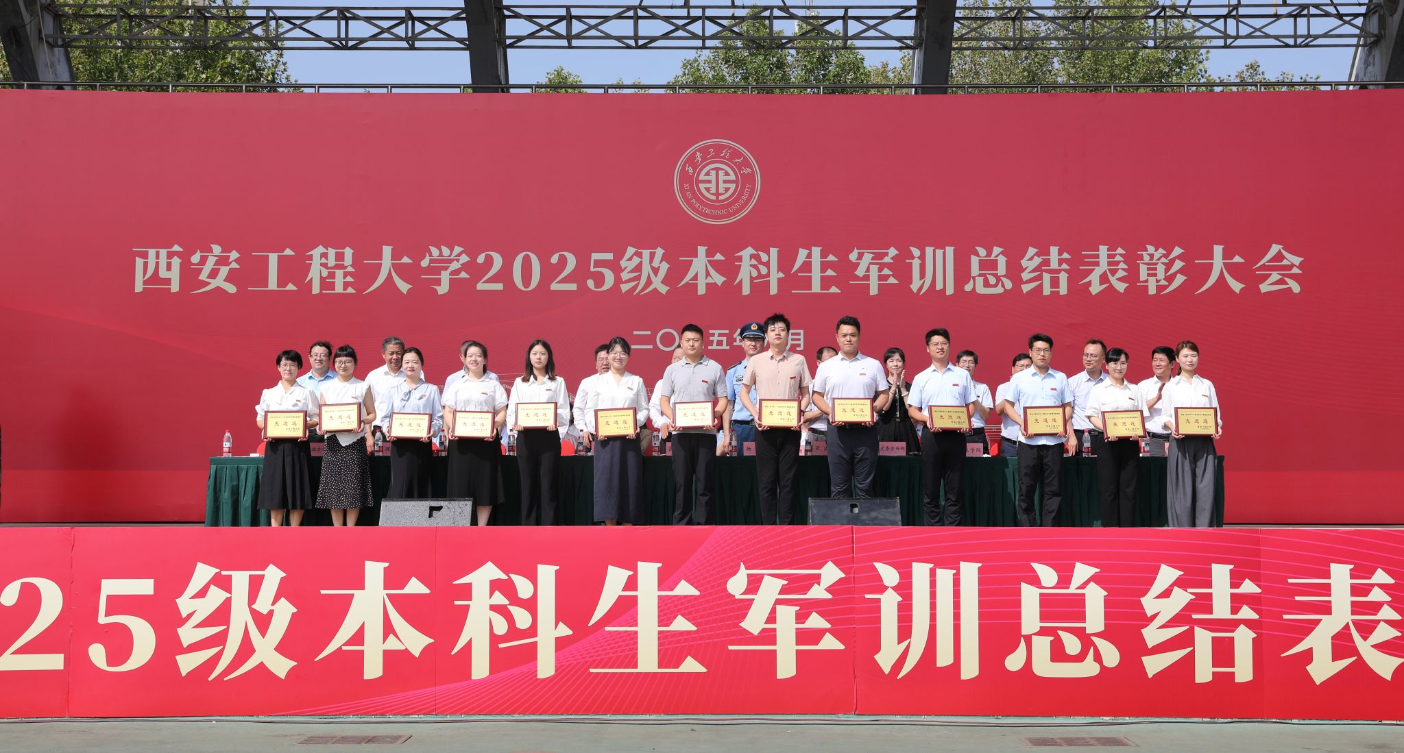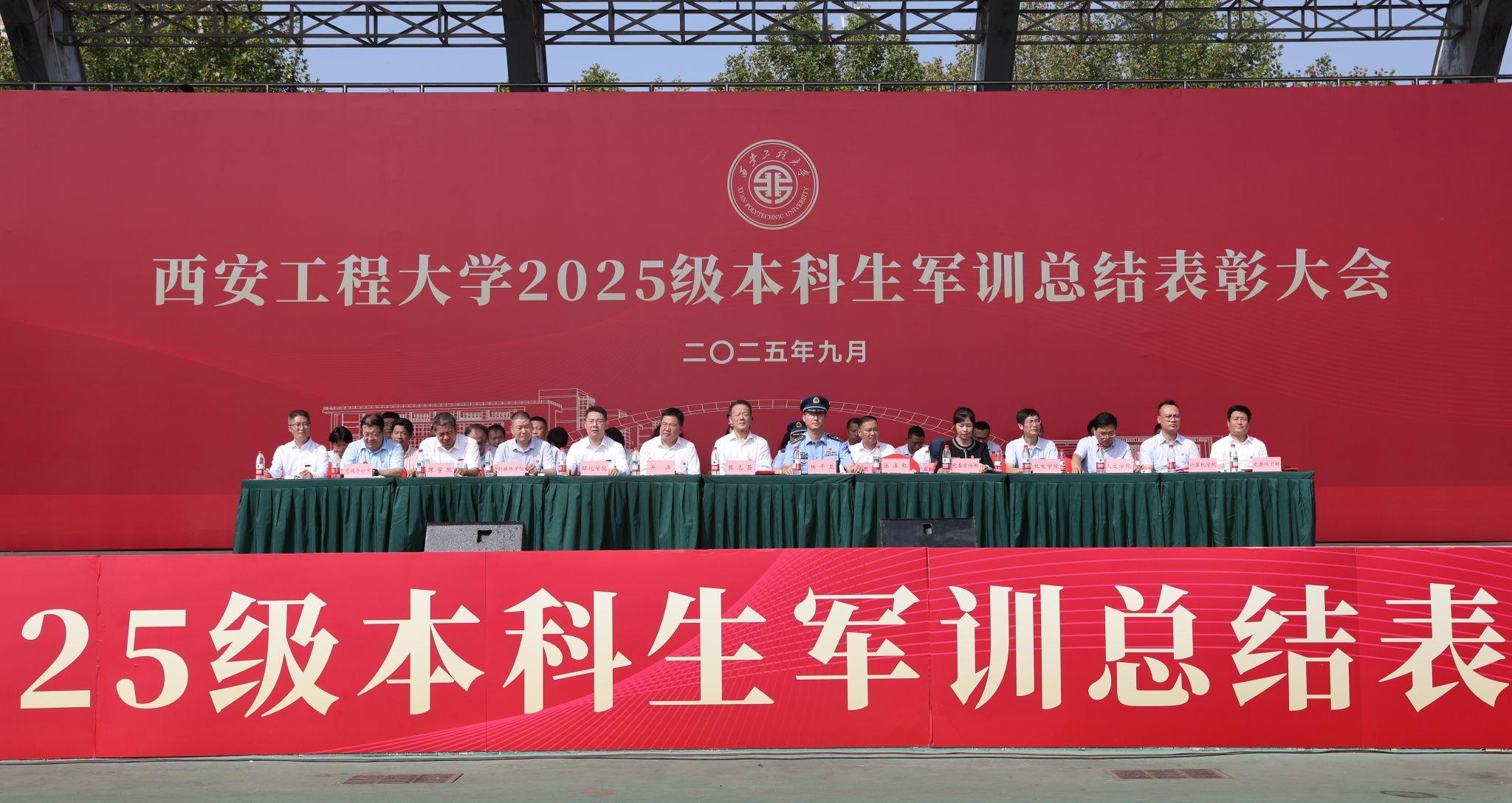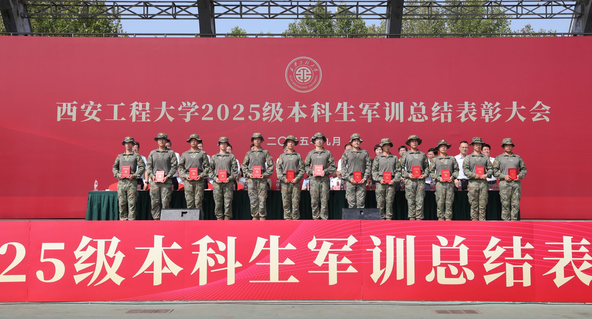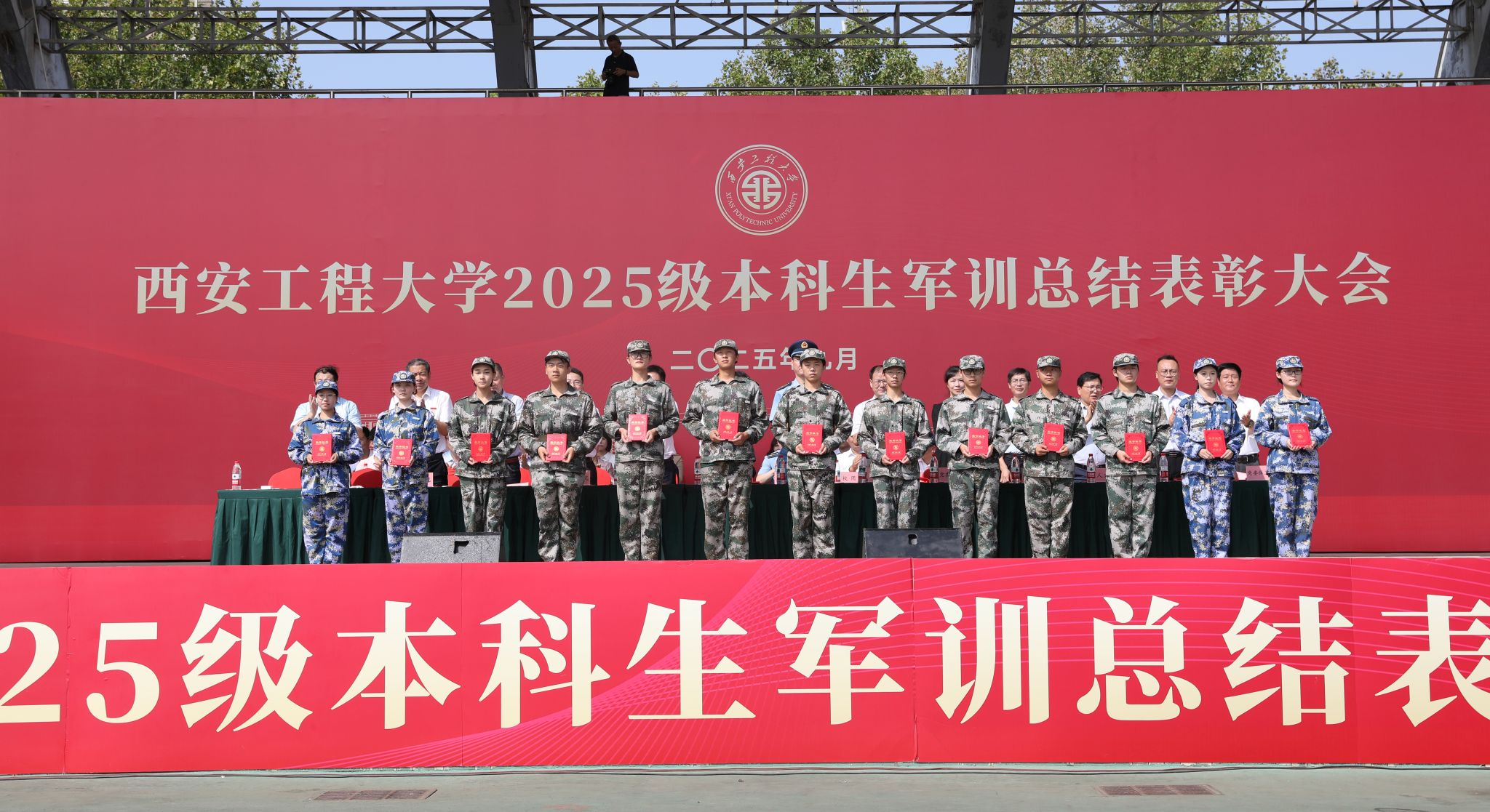 9月14日,beat365在临潼校区骊风体育场举行2025级新生军训总结表彰大会。校党委书记张志昌、校党委副书记井浩、副校长张洛红出席表彰大会。校国防教育暨学生军训领导小组各成员单位负责人、各学院党委书记、军训旅各团政委、军训办公室成员、全体承训教官、军训辅导员和4083名本科新生参加大会。