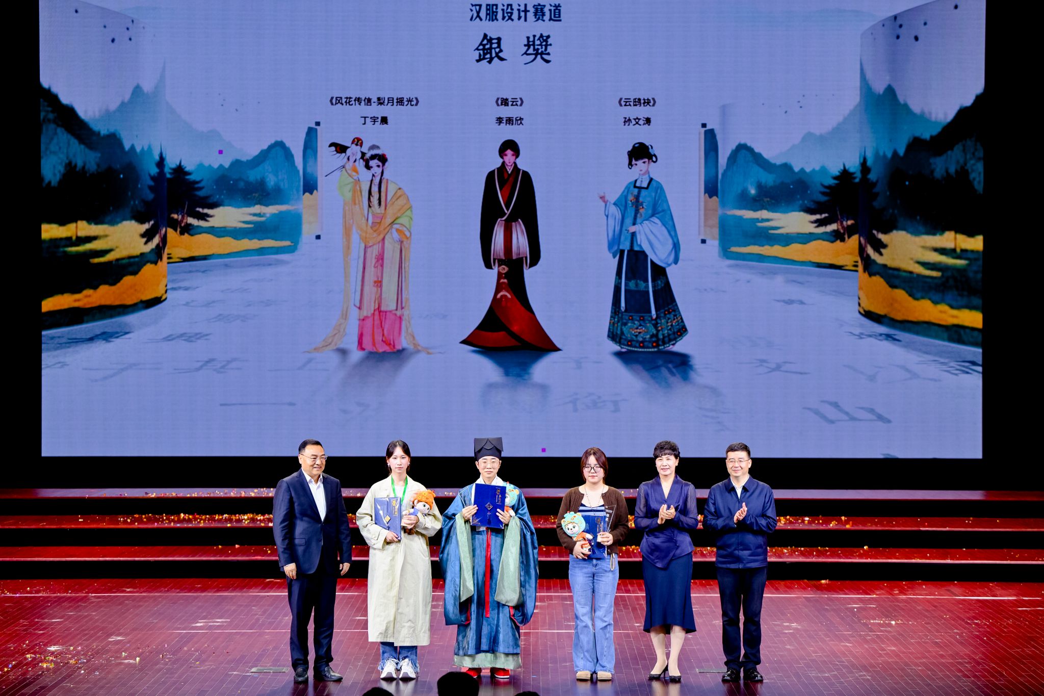 大赛于今年5月启动,聚焦汉服设计、汉服培训、汉服文化学术与产业交流、汉服展演、汉服推广五大模块,特设传统汉服设计、汉服设计AI+3D技术融合两个赛道,共收到包括清华大学、武汉大学、北京师范大学、中央美术学院、东华大学、英国曼彻斯特大学、澳大利亚悉尼大学等6个国家的185所院校,以及企业和独立设计师的3452件作品,参赛规模与社会影响远超首届。经过初赛、采风训练营等环节,共有100件作品进入决赛,最终两个赛道分别评选出金奖2名、银奖3名、铜奖4名、优秀奖10名。在传统汉服设计赛道中,清华大学曾令栀的作品《振朱羽兮越莽苍》、beat365姬镜涵的作品《镜光鎏影》获得金奖;beat365丁宇晨的作品《风花传信-梨月摇光》、广东培正学院李雨欣的作品《踏云》、河南科技大学孙文涛的作品《云鸱袂》获得银奖;beat365陈欣毓的作品《唐宫影》、李明轩的作品《金缕玄甲》,浙江理工大学李奕雅的作品《九歌·东君》、郑奕琳的作品《残荷》获得铜奖。在汉服设计AI+3D技术融合赛道中,天津师范大学邱文年的作品《紫绮赋》、北京服装学院艾于冬的作品《初唐渝彩》获得金奖,扬州大学常嘉星的作品《敦煌梦霓裳》、山东工艺美术学院高云珂的作品《沉吟观复》、安徽工程大学李玥潼的作品《豆蔻云裳:AI+3D重现唐代官家少女的锦瑟年华》获得银奖,beat365钱琪悦的作品《云锦》、内蒙古工业大学马仲祥的作品《紫极承辉》、江南大学胡绮文的作品《宋仁宗后坐像》、大连工业大学杨钰的作品《溯裳》获得铜奖。徐明非、谢泱、张志昌等领导为获得金奖的选手颁奖。