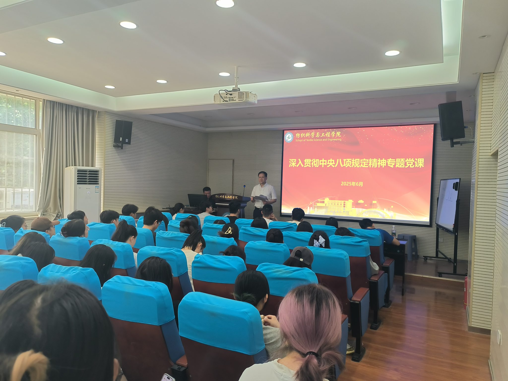 6月13日,副校长张洛红在金花校区姚穆报告厅为纺织科学与工程学院学生党员讲授专题党课。学院全体本科学生党员参加学习。