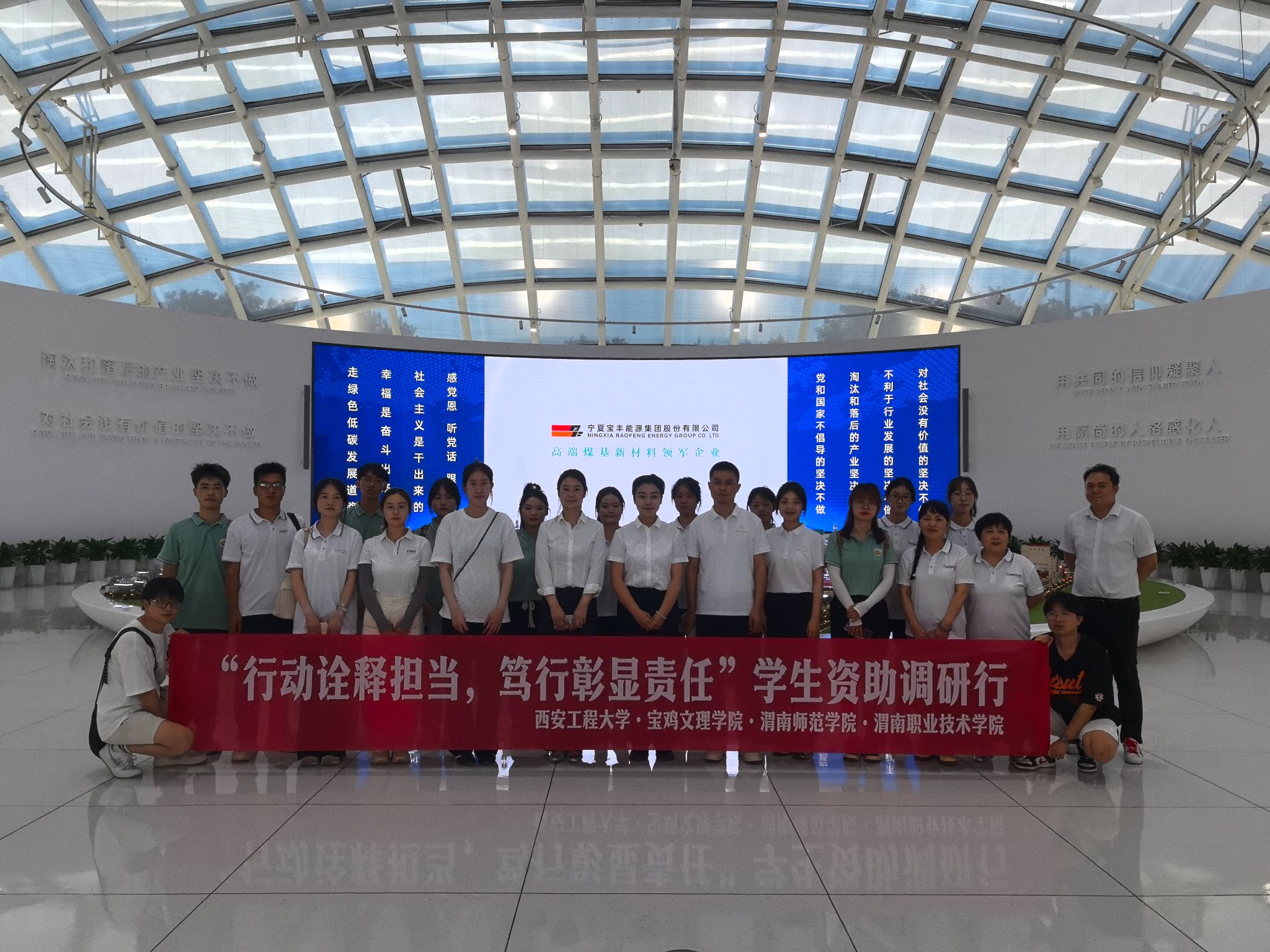 活动首站,师生们前往宁夏宝丰能源集团进行实地考察。通过现场参观及专业人员的讲解,团队成员对该企业在循环经济与新能源领域所取得的创新成果有了深入认知。随后,师生们深入田间旷野,对“农光一体化”绿色产业发展的新形态展开调研,详细了解了“农光一体化”项目对农民生活及农业生产的积极影响。