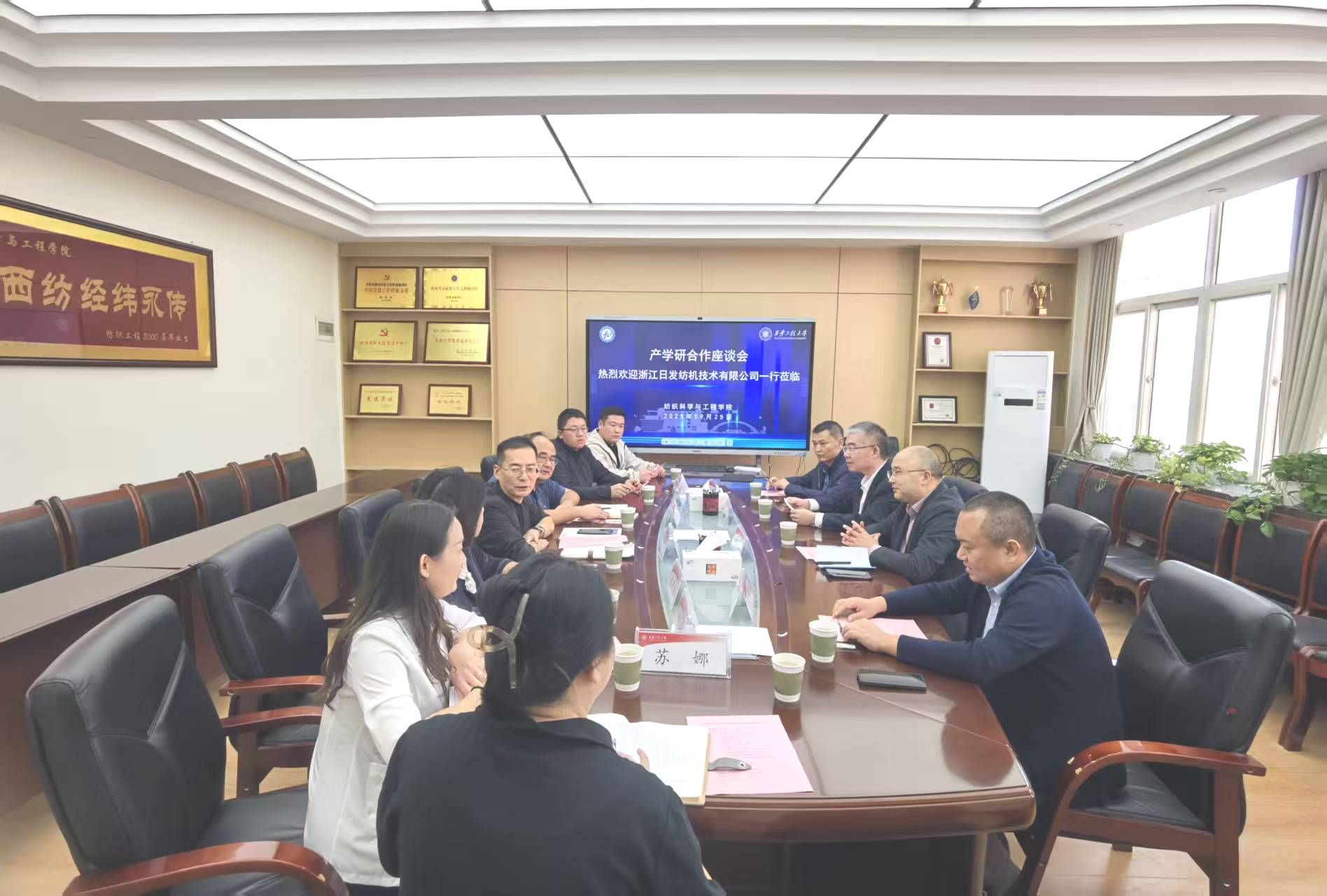 刘哲从学院发展历程、学科建设、人才培养等方面详细介绍了学院整体情况,展示了学院的教学和科研成果,特别是学院在纺织领域的特色优势与创新成就,表达了与浙江日发纺机技术有限公司建立长期稳定合作关系的意愿。