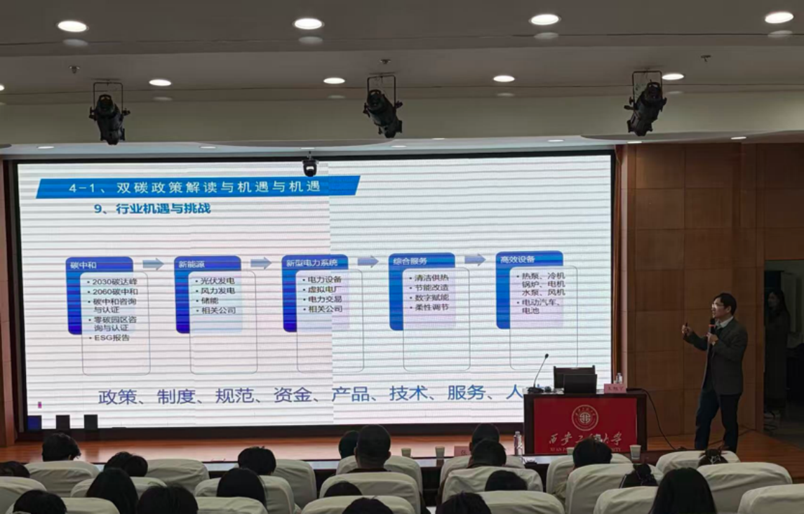 电信学院邀请王旭宁为学院200余名电气专业研究生、本科生作专题讲座。王旭宁以《如何抓住“双碳”和AI时代的发展机遇》为题,结合自身深耕行业多年的实践经验,从政策导向、技术迭代、产业应用三个维度展开分享。他系统解读了“双碳”目标下绿色能源、碳核算等领域的发展现状,深入剖析了人工智能与低碳技术融合的核心应用场景,通过智能电网优化、新能源储能监测等鲜活案例,重点剖析虚拟电厂、电力现货交易、建筑节能等热门领域的发展潜力,具象化呈现“AI+‘双碳’”的产业价值。同时,他结合自身职业发展经历,提出“夯实专业基础、培养跨界思维、强化实践能力”的立身成长之道,并为青年学子提供了精准的学习与职业规划建议。