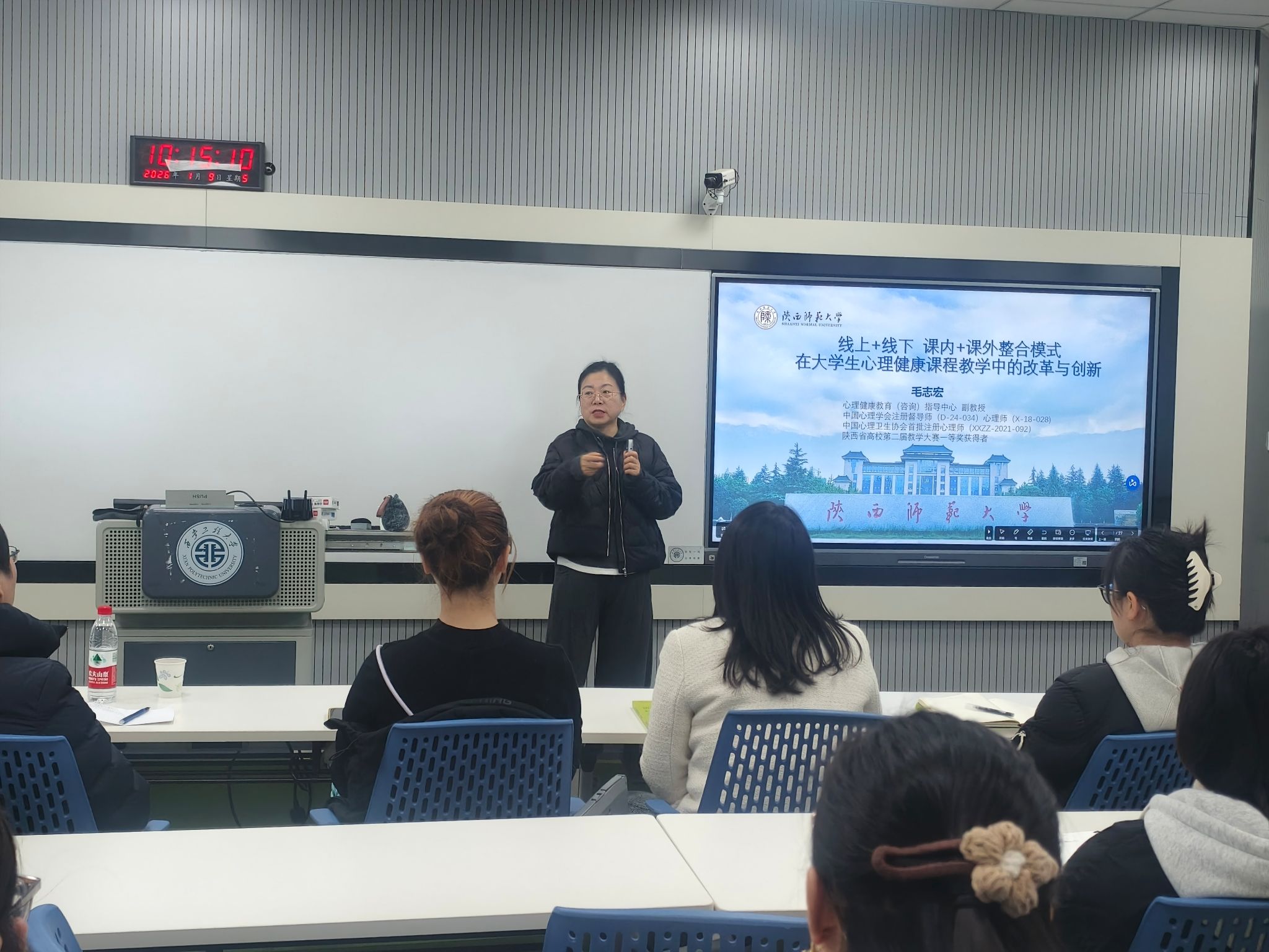 会议特邀陕西师范大学心理健康教育(咨询)指导中心毛志宏副教授作专题培训。毛志宏以“线上+线下、课内+课外整合模式在大学生心理健康课程教学中的改革与创新”为主题,系统阐述了课程建设的核心要求与实施路径,强调要依托数字平台拓展教学资源、优化课程结构、提升教学实效,推动教师教学与科研能力协同发展。