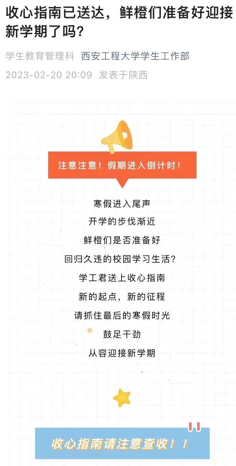 氛围营造“浓”起来,让学生开心返校。相关部门积极开展学生返校工作宣传报道、强化舆论引导、管好各类宣传阵地、持续做好常态化疫情防控宣传等方面工作,对校内橱窗、展板、横幅等宣传阵地进行了更新,通过校园新媒体平台向师生推送了返校须知和开学防疫指南等信息,为2023年春季开学营造浓厚氛围。学校线上线下各类宣传阵地同频共振,实时发布开学须知、疫情防控等内容,积极营造健康、文明、和谐、稳定的校园文化氛围。