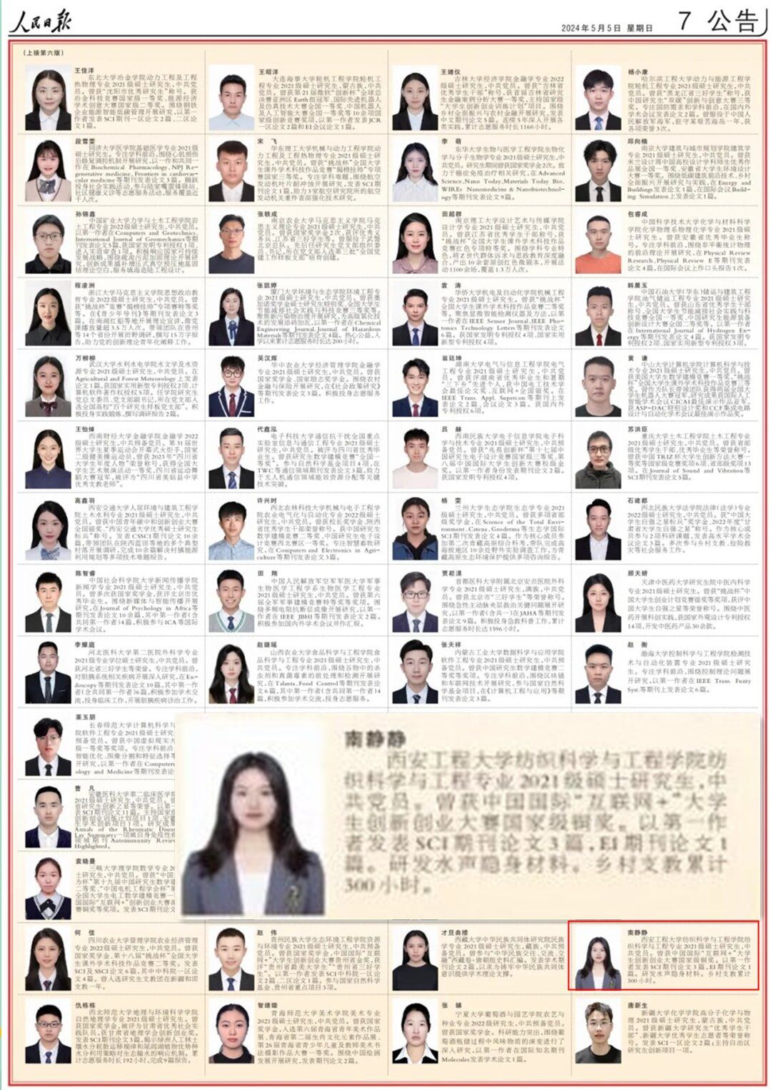 今年五四青年节之际,《人民日报》刊登了《2022—2023学年度研究生国家奖学金获奖学生代表名录》,beat365纺织科学与工程学院研究生南静静作为陕西省属高校唯一获奖研究生光荣上榜(全国仅100人),这也是beat365学生首次荣登该名录。