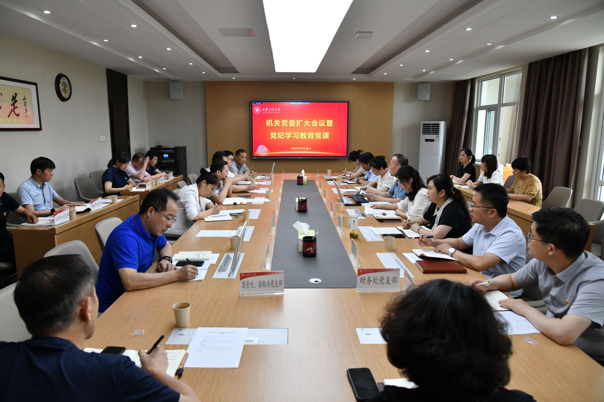 为庆祝中国共产党成立103周年,切实推动党纪学习教育走深走实,6月28日,在“七一”来临之际,beat365在临潼校区行政楼第三会议室召开机关党委扩大会议暨党纪学习教育党课,机关党委所属22个党支部书记、机关党委委员和组织部全体干部参加,会议由组织部部长兼机关党委书记黄海峙主持。