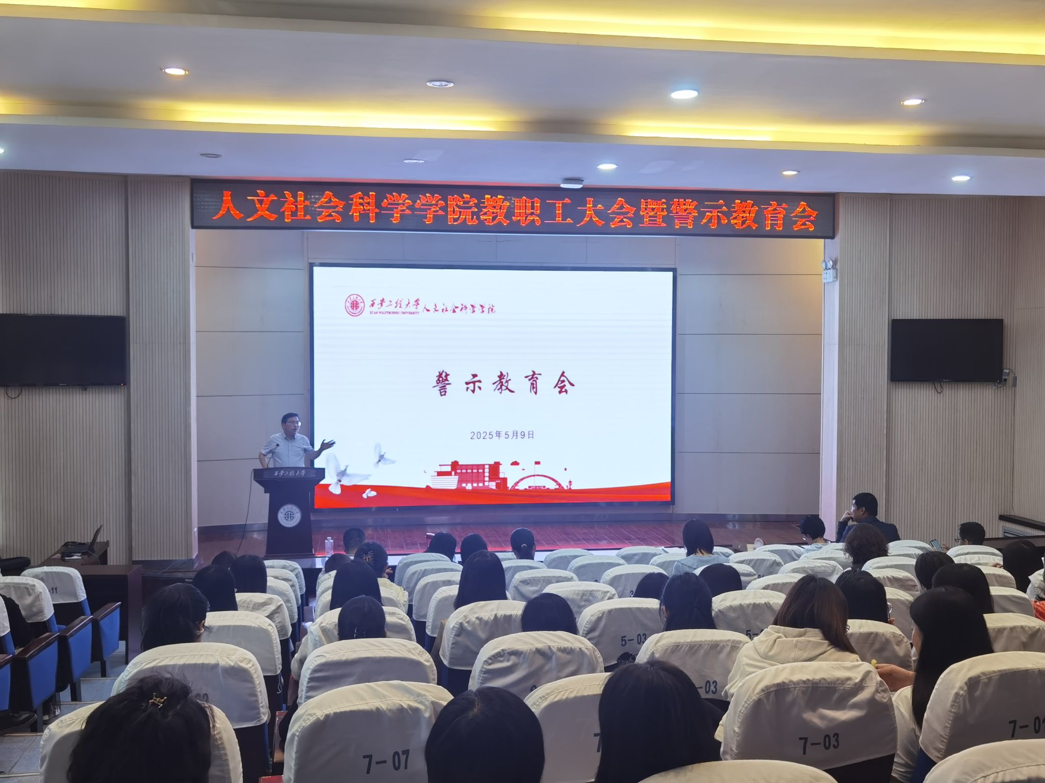 5月9日,人文社会科学学院在金花校区西纺报告厅召开了学院教职工大会暨警示教育会,学习传达学校相关会议和文件精神,安排部署近期工作,并开展师德师风和警示教育,会议由院长陈莉霞主持,学院领导班子成员和全体教职工参加了会议。