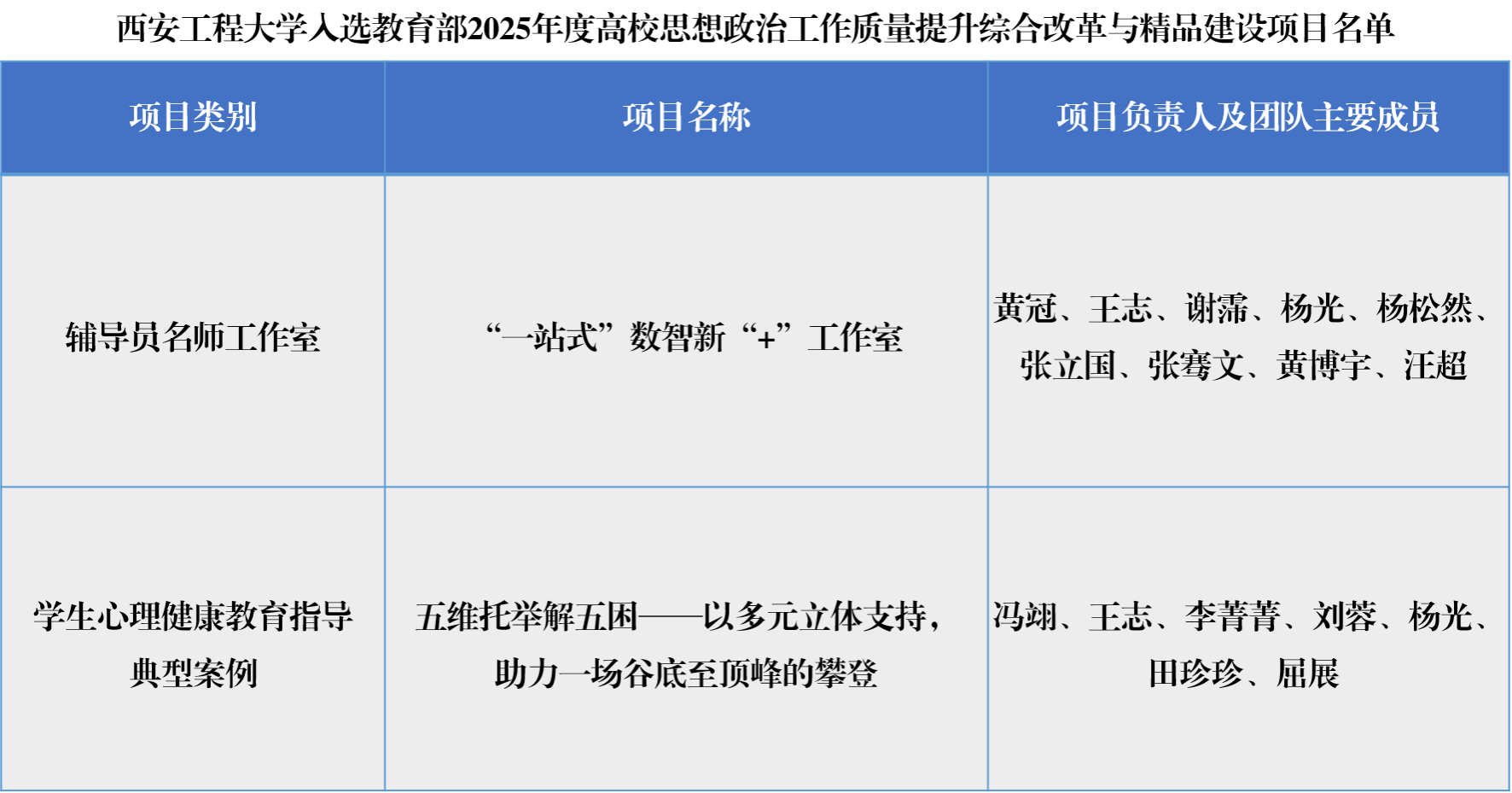 2个项目的成功入选,是学校辅导员队伍建设取得的又一突破性成果,也是对学校思想政治工作的充分肯定,将有力支撑学校教育教学改革、“双一流”建设等工作。2025年,学工部将以入选全国思政工作精品建设项目为契机,全面落实学校第三次党代会提出的“两步走”战略和“十大工程”,以蛇行千里的劲头持续深化学生工作“铸魂”“赋能”“固基”“精业”四项行动,整合校内外各方面育人资源和力量,发挥学校学科专业优势,不断完善学生工作项目“储备—培育—孵化”体系,以有组织项目建设驱动辅导员队伍专业化职业化专家化发展,产出一批具有影响力和显示度的学生工作理论及实践研究成果,为新时代学校事业高质量发展贡献学工力量。
