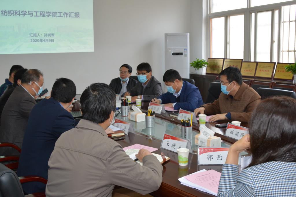 2020年4月9日,校党委书记马万清到纺织科学与工程学院调研工作,副校长兼纺织学院院长李鹏飞、党政办负责人及纺织学院领导班子成员参加了调研座谈会。学院党委书记胡小进主持会议。座谈会上,执行院长孙润军从学院基本情况、“十三五”取得主要成绩、发展存在主要问题及解决措施等四个方面对学院行政工作进行了汇报。胡小进从学院党委概况、近年来党建工作开展情况、存在问题及今后努力方向等三个方面对学院党委工作进行了汇报...