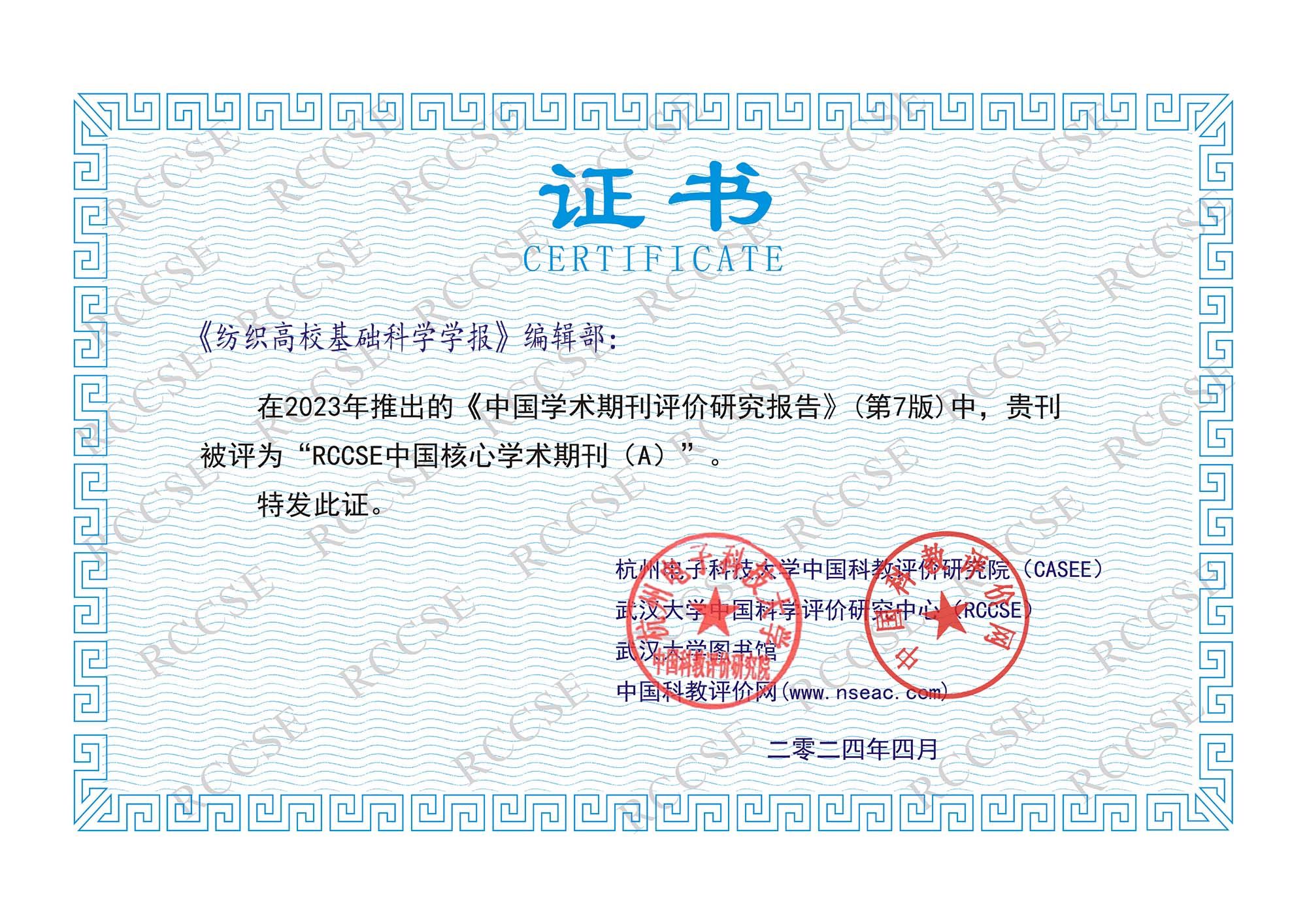 近日,武汉大学中国科学评价研究中心(RCCSE)公布了最新一期的学术期刊评价结果《中国学术期刊评价研究报告(第7版)》,beat365《beat365官方网站学报》《纺织高校基础科学学报》双双被评为“RCCSE中国核心学术期刊(A)”, A级代表学科领域排名前5%~20%的期刊。RCCSE中国学术期刊评价体系是目前国内七大学术期刊评价体系之一,是我国社会科学和自然科学领域研究的重要检索、分析和学术评价工具。RCCSE《中国学术期刊评价研究报告...