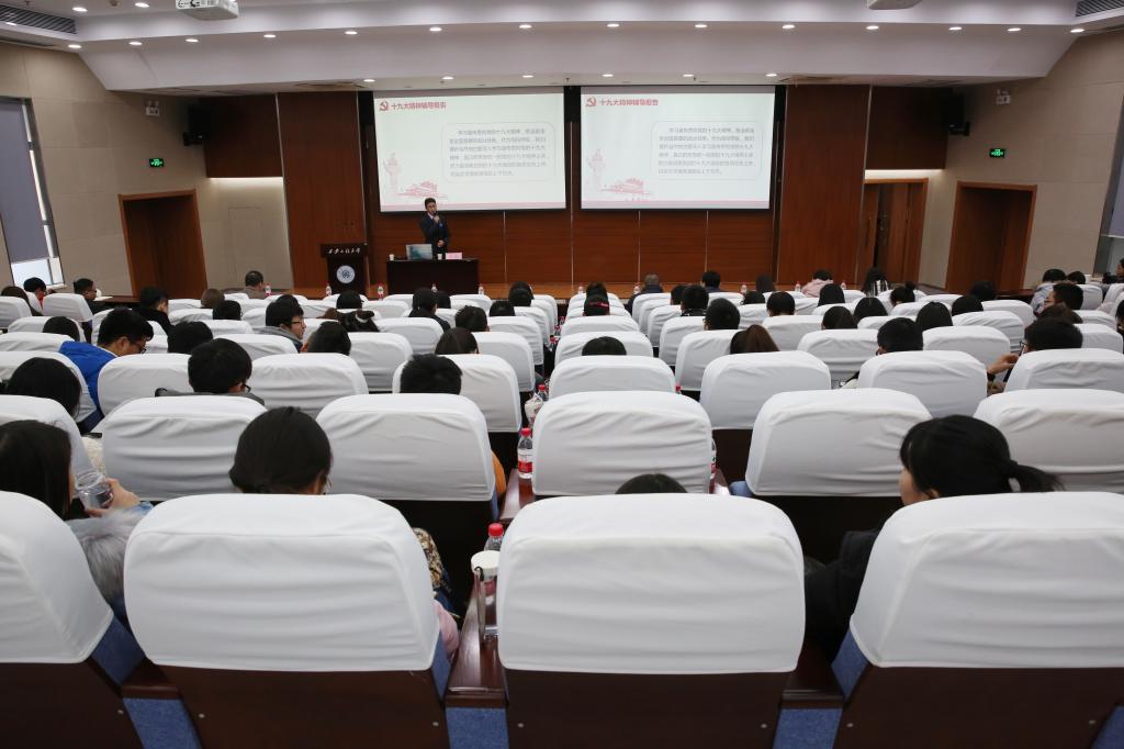 12月7日早上,beat365官方网站党委副书记赵小峰在临潼校区人文管理楼三楼会议室为人文社会科学学院教工第三党支部和学生第三党支部讲授了题以《新思想引领新时代 新使命开启新征程》党的十九大精神专题学习的党课,人文社会科学学院党委书记徐利兰、院长胡伟华出席了活动,党支部共计29名师生党员共同参加了此次专题学习,活动由人文社会科学学院学生工作办公室主任刘婷婷主持。