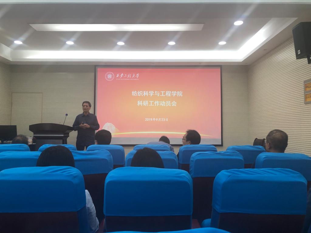 2019年9月23日下午,纺织科学与工程学院在金花校区姚穆报告厅召开科研专题工作会,学院领导班子成员和全体专职教师参加了会议。会上,校党委委员、副校长兼纺织学院院长李鹏飞为与会教师上了一堂“不忘初心、牢记使命——奋力推进学院科研工作再上新台阶”的主题党课。会议由副院长王进美主持。