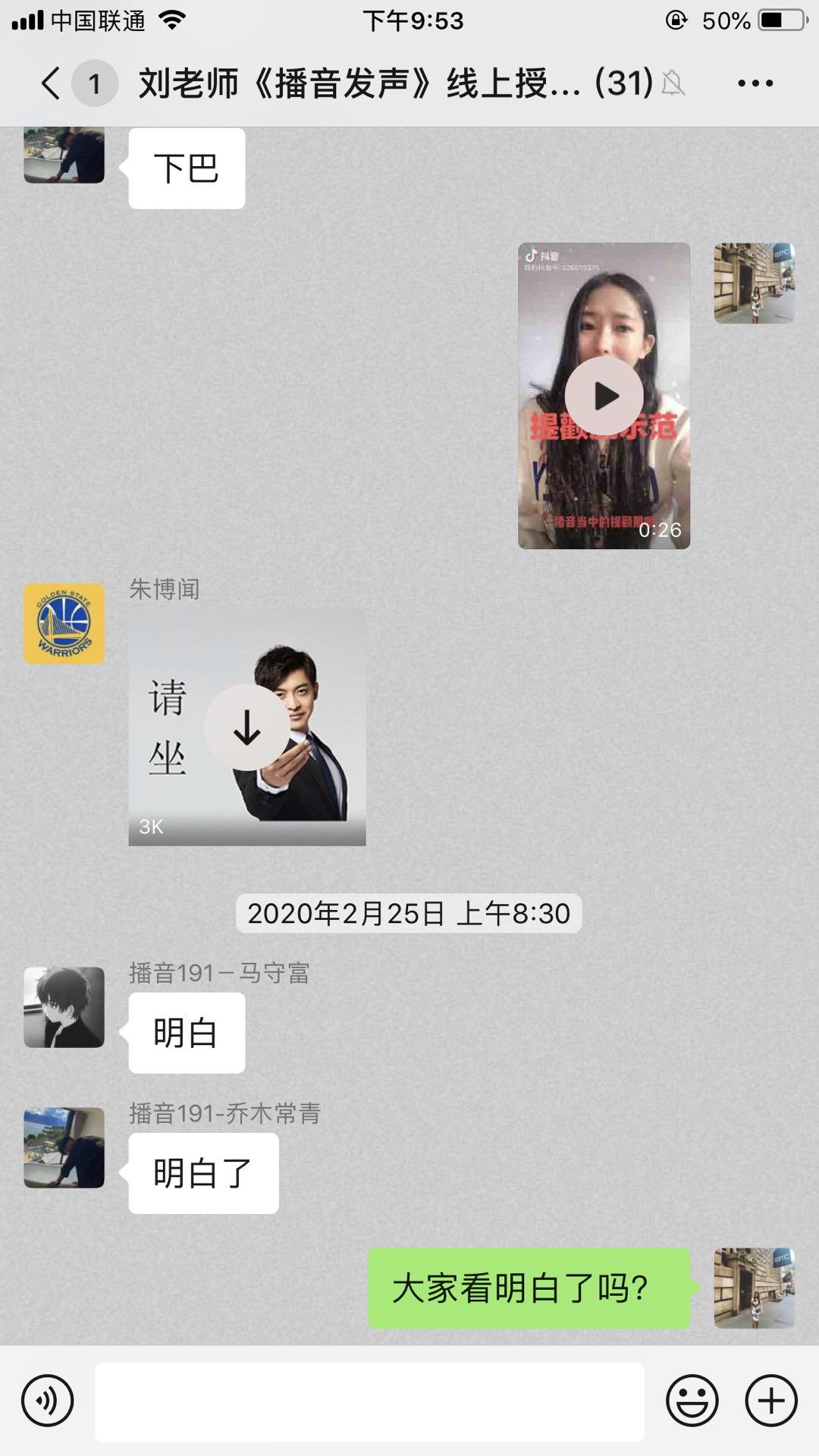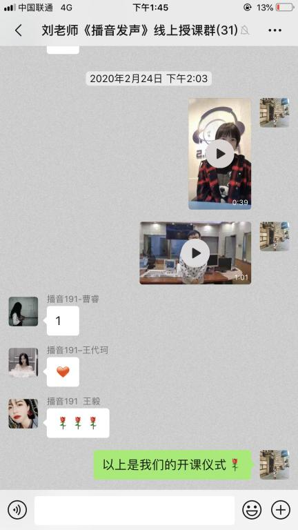 播音专业的刘丽娟老师这学期代大一的专业课《播音发声》,为保证能都对学生进行一对一的语音示范与指导,刘老师选择了音质效果最无损的微信群语音授课。她将自己提前录制好的示范视频和音频发到群里,并配合语音讲解让学生更直观的理解。将课堂内容以备忘录的形式做成照片发在微信群,学生可以一边看知识点,一边听语音。课上微信群里师生频繁互动,完成专业学习。