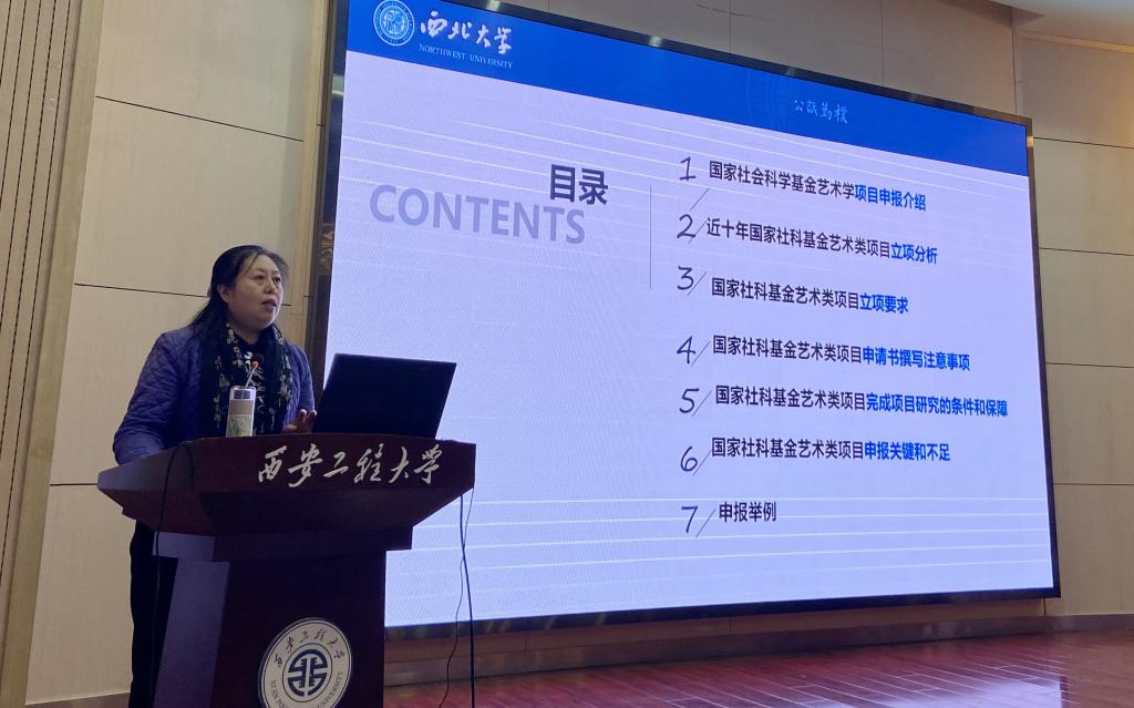 随后,朱耀麟简要介绍了此次培训会的专家——西北大学艺术学院尹夏清教授的学术情况。之后,尹夏清教授为到场师生做了“国家社科基金艺术学项目申报研究”的报告。他的报告分为国家社科基金艺术学项目介绍、近十年国家社科基金艺术学项目立项分析、国家社科基金艺术学项目立项要求、申请书撰写注意事项、完成条件和保障、申报关键和不足等七个方面。她重点从“新、高、重、广、深、实、勤”七个角度详细阐述了申报书的撰写技巧和注意事项,对申报中常见的论证失误进行解读,提出了正确的描述方法和规避要点。最后,结合自己的学习工作经历,以个人已立项的申报书为例,从题目的拟定到各部分论证内容如何选择和撰写进行了详细的分步讲解,为教师申报项目选择方向和理清思路提供了参考。