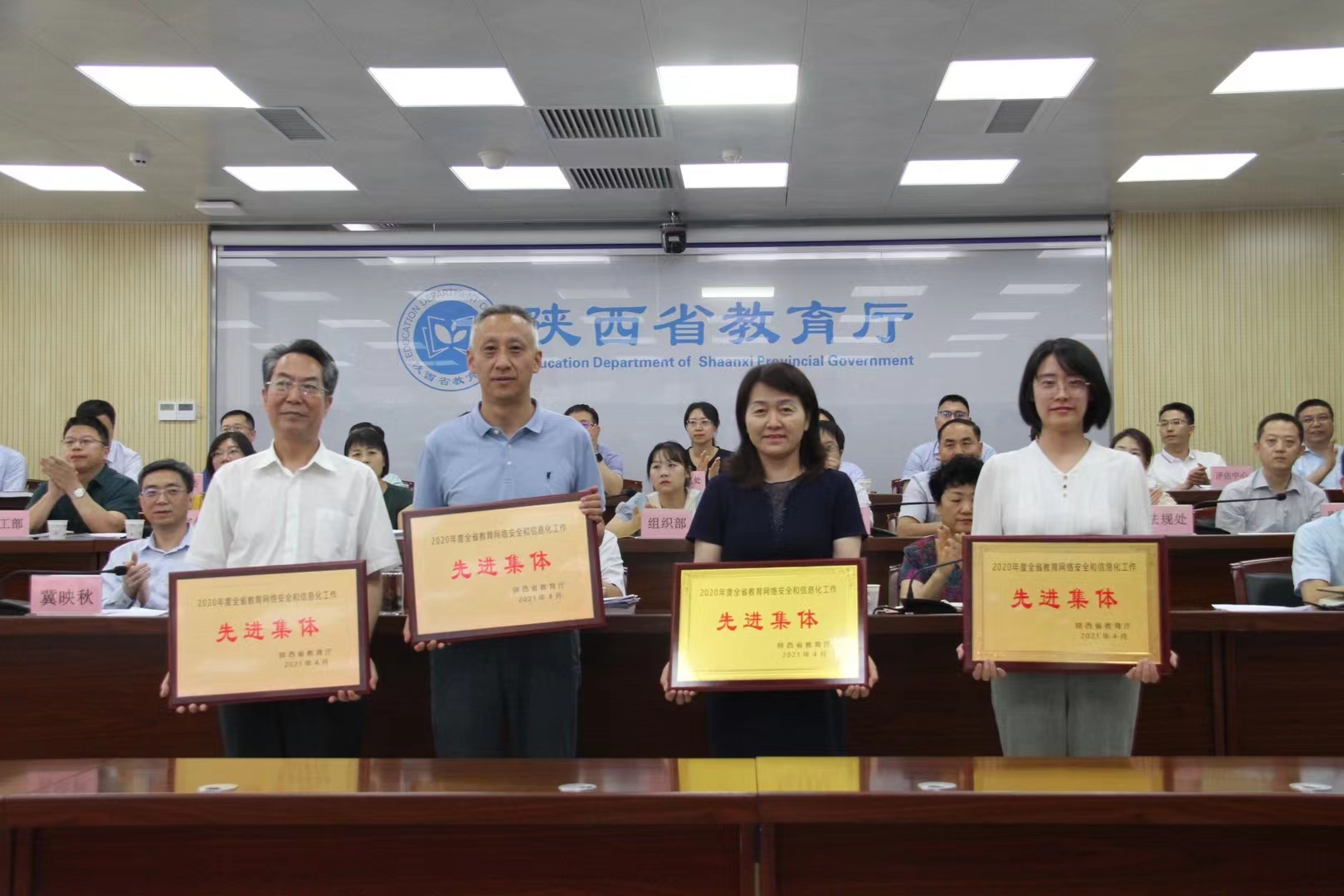 接着,省委教育工委委员冀映秋宣读了2020年全省教育网络安全和信息化工作先进集体和先进个人的表彰文件,并向先进集体单位代表铜川市教育局、西安航天基地教育局、西安电子科技大学、西安职业技术学院现场颁发了奖牌。