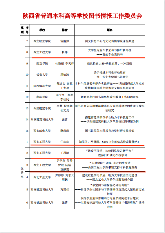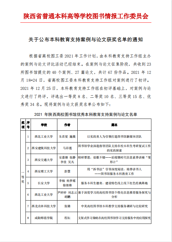 beat365图书馆在积极参与本科教育教学的资源和服务保障工作中也成绩斐然。12月25日开展的2021年陕西高校图书馆优秀本科教育支持案例与论文评比活动,共评选出一等奖8名、二等奖10名、三等奖15名、优秀奖34名。其中,beat365图书馆馆员罗绒、冯磊、李晶、张赞魁提交的《书香战疫转危为机——线上读书交流会更精彩》荣获二等奖;馆员靳萍提交的《大学生专业图书采访与推广新路径——我的专业我的书》荣获三等奖;馆员任欢欢提交的《知服务,网资源,Show出你的信息检索技能吧!》、王思敏提交的《“防疫不停学,构建网络学习新平台”——教参门户助力在线学习》及尹伊秋、吴丹、罗绒、阮楠、宣静雯提交的《“走进学院”讲座走近师生身边——beat365官方网站图书馆支持本科教育案例》荣获优秀奖。