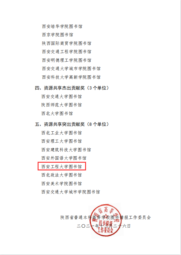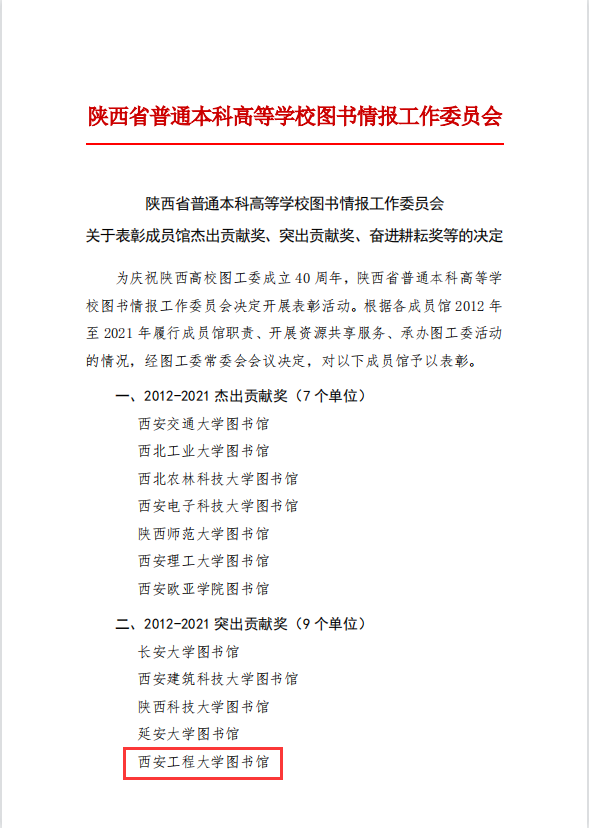 为了庆祝陕西高校图工委成立40周年,12月30日,陕西省普通本科高等学校图书情报工作委员会在线上召开“陕西高校图工委成立40周年暨2021年度工作会议”。会议系统总结了陕西省高校图工委40年来的发展和成就,并根据各成员馆2012年至2021年履行成员馆职责、开展资源共享服务、承办图工委活动的情况表彰了“2012-2021杰出贡献奖”“2012-2021突出贡献奖”“2012-2021奋进耕耘奖”“资源共享杰出贡献奖”及“资源共享突出贡献奖”。其中,beat365图书馆荣获“2012-2021突出贡献奖”及“资源共享突出贡献奖”两项殊荣。此外,会议还表彰了“高校图书馆榜样馆员”及“学术标兵”,beat365图书馆副馆长尹方屏荣获“高校图书馆榜样馆员”称号。