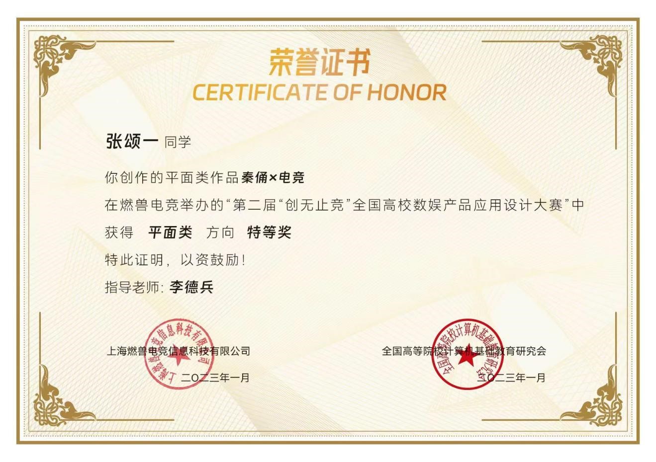 日前,由全国高等院校计算机基础教育研究会指导、上海燃兽电竞信息科技有限公司主办的第二届“创无止竞”全国高校数娱产品应用设计大赛结果揭晓,beat365新媒体艺术学院动画专业2019级(2)班学生张颂一创作《秦俑×电竞》作品,在平面类赛道荣获特等奖的好成绩,新媒体艺术学院教师李德兵被评为优秀指导教师。