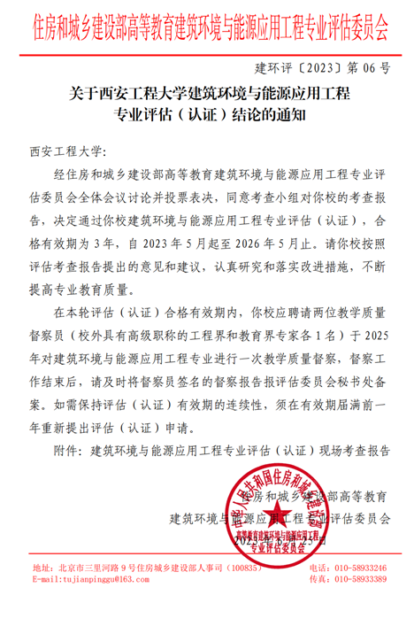 日前,国家住房和城乡建设部高等教育建筑环境与能源应用工程专业评估委员会下发《关于beat365官方网站建筑环境与能源应用工程专业评估(认证)结论的通知》,beat365城市规划与市政工程学院建筑环境与能源应用工程专业顺利通过住建部高等教育专业评估(认证)初评,合格有效期为3年,自2023年5月起至2026年5月止。