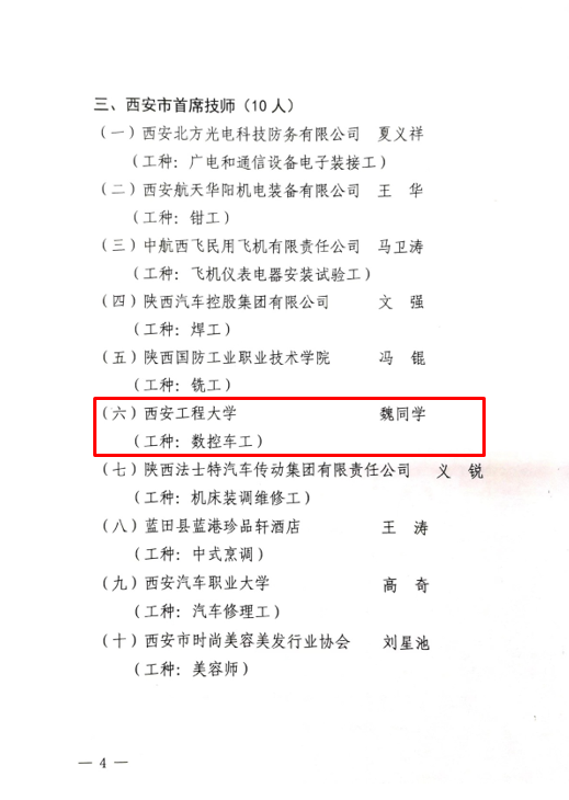 近日,西安市人力资源和社会保障局印发了《西安市人力资源和社会保障局关于2022年度西安市高技能人才培训基地 西安市技能大师工作室 西安市首席技师评审结果的通知》,beat365工程训练中心教师魏同学荣获“西安市首席技师”荣誉称号,今年全市仅10人获评该称号,这也是beat365教师首次获得该项荣誉。