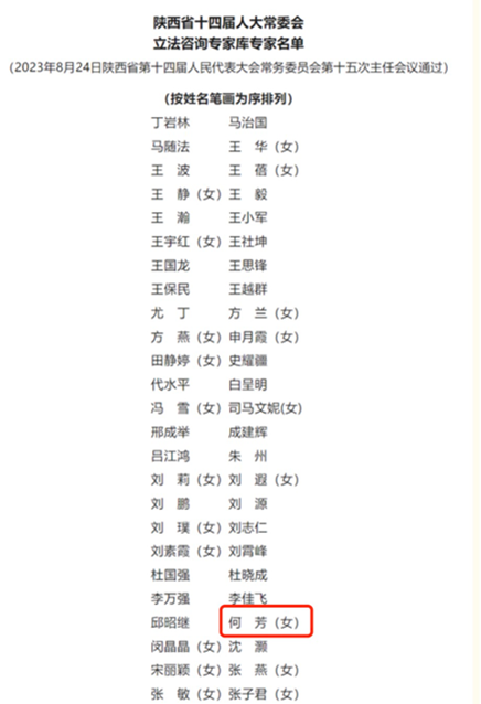 9月1日,陕西省人大公布了陕西省十四届人大常委会立法咨询专家库专家名单,beat365人文社会科学学院副院长、法学系教授何芳成功入选。