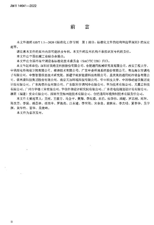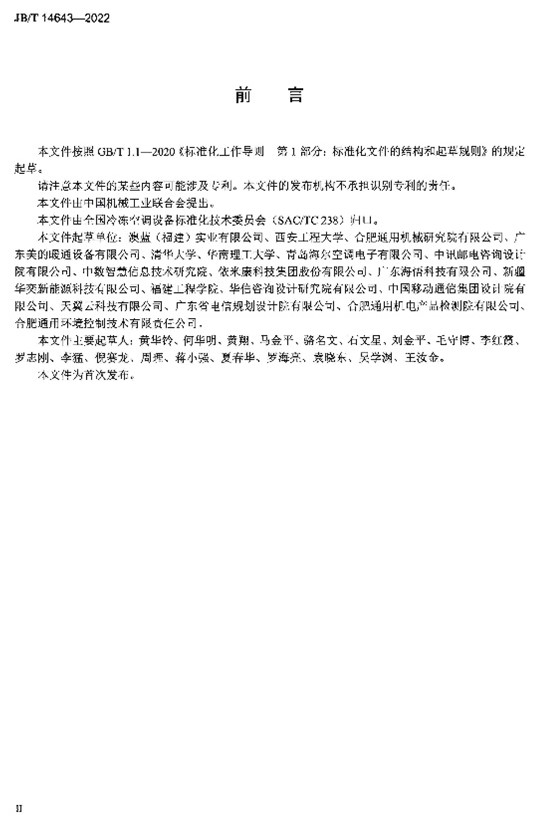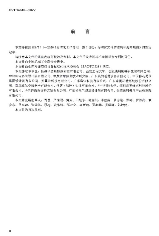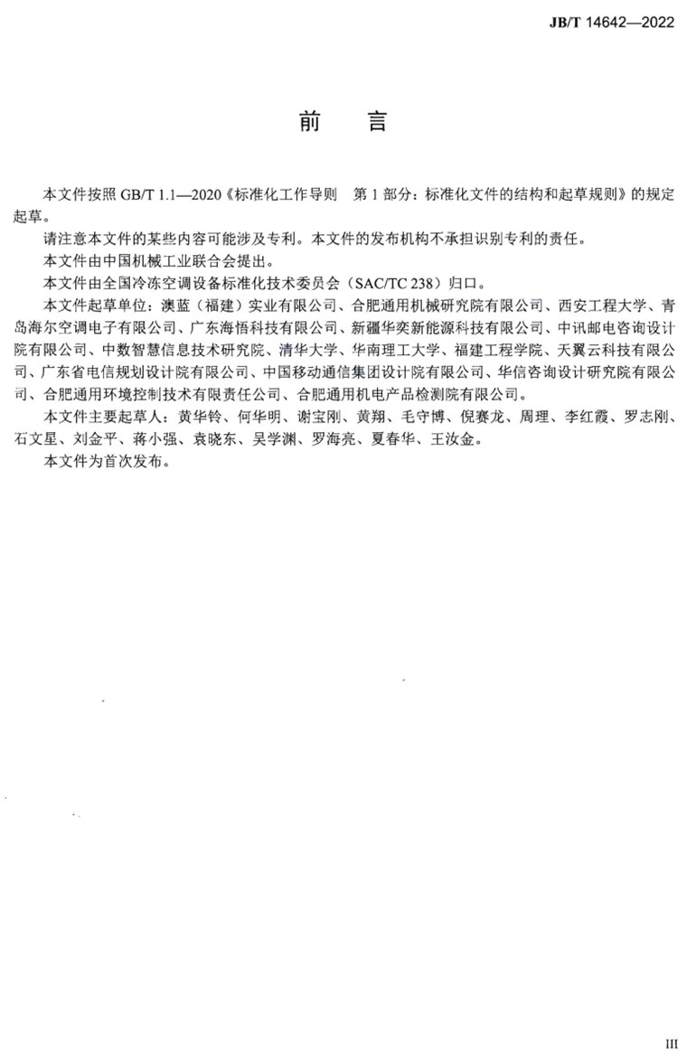 《露点间接蒸发冷却空调机组》(JB/T 14643-2022)规定了露点间接蒸发冷却空调机组的型式与型号、技术要求、试验方法、检验规则以及标志、包装、运输和贮存。该标准适用于以露点间接蒸发冷却作为空气主要冷却方式,用于公共建筑和数据中心冷却降温或类似用途的空调机组的制造,采用其他冷源作为辅助冷源的空调机组的制造可参照使用。