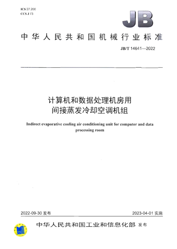 《计算机和数据处理机房用间接蒸发冷却空调机组》(JB/T 14641-2022)规定了计算机和数据处理机房用间接蒸发冷却空调机组为技术要求、试验方法、检验规则以及标志、包装、运输和贮存。该标准适用于计算机、数据处理机和通信设备等机房用的间接蒸发冷却空调机组的制造。