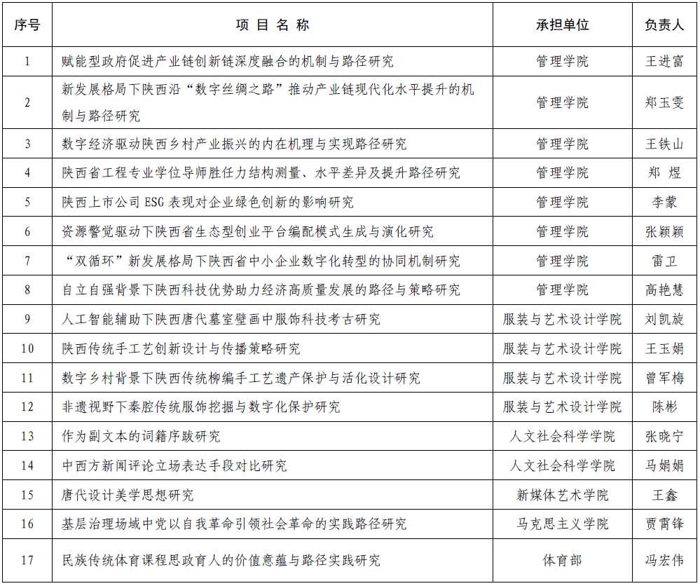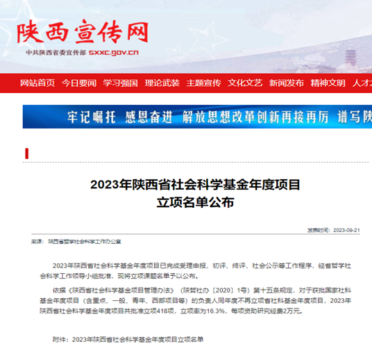 9月21日,陕西省哲学社会科学工作办公室公布了2023年陕西省社会科学基金年度项目立项名单,全省共立项418项,立项率为16.3%。beat365本年度申报68项,立项17项,立项数位列省属高校第五,立项率达到25%。本年度获批数比近三年年均获批数提高约70%,创历史新高。(撰稿:王立 审稿:张洛红)