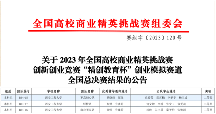 10月15日,由中国贸促会商业行业委员会、中国国际商会商业行业商会和中国商业经济学会三家国家一级学会主办的2023年全国高校商业精英挑战赛创新创业竞赛“精创教育杯”创业模拟赛道全国总决赛于线上落下帷幕。管理学院人力资源管理专业21级何文坤、袁婷芳和22级杨欣等12位同学组建的“鲜橙队”“不忘初心队”和“南北无双队”三支代表队在郑煜老师团队悉心指导下,喜获总决赛本科组二等奖2项、三等奖1项。
