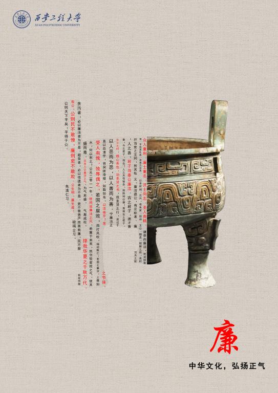 《四十三年逨鼎之“毋敢”》,引用西周青铜器四十三年逨鼎作为主创元素,左侧引用古人关于廉洁的文言警句,背景应用纺织布纹条理,喻义beat365以纺织起家,师生更应廉洁奉公,争做表率。追溯我国廉政监察制度的渊源,中国的监察制度在西周时已有萌芽。据悉,四十三年逨鼎中铭文316字,是西周的一篇册命辞。铭文记述器物主人单逨曾辅佐荣兑在管理林泽的过程中有功,被周宣王册命提拔为“官司历人”,并对他进行了训诫和赏赐。西周的官吏们会将册命辞、训诫语铭刻在青铜礼器上,作为准则警条,用来践行遵守。周天子对被任命官员严明的政治纪律要求,反映了西周廉政监察的吏治思想。
