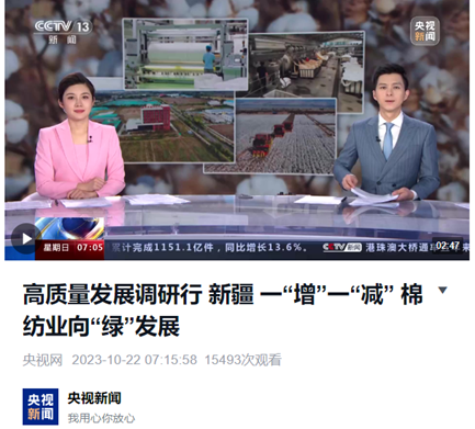 近日,央视新闻客户端进行了题为“高质量发展调研行丨新疆:一朵棉花“链”起产业集群”的新闻报道,“朝闻天下”栏目就“新疆一‘增’一‘减’棉纺业向‘绿’发展”进行了专题报道。报道就库尔勒汇同泰印染科技有限公司的深度节水减排染色新技术及盐回用技术进行了重点报道。