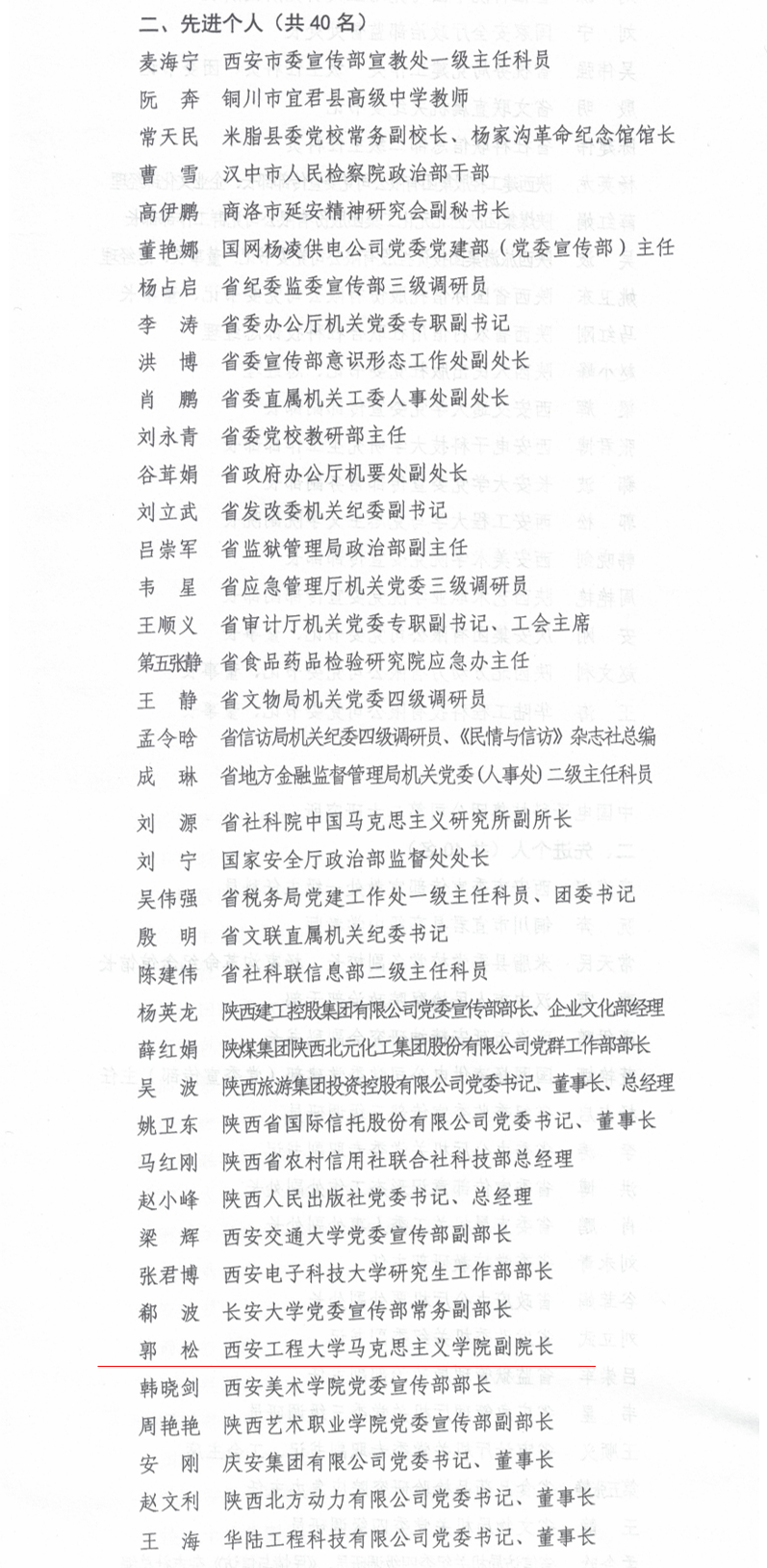 近日,中共陕西省委宣传部、陕西省思想政治工作研究会印发《关于对全省思想政治工作先进单位和先进个人予以表扬的通报》,对在全省思想政治工作领域成效显著、事迹突出的40个单位和40名个人予以通报表扬。beat365马克思主义学院郭松同志荣获“全省思想政治工作先进个人”。这是beat365教工首次获评此称号。