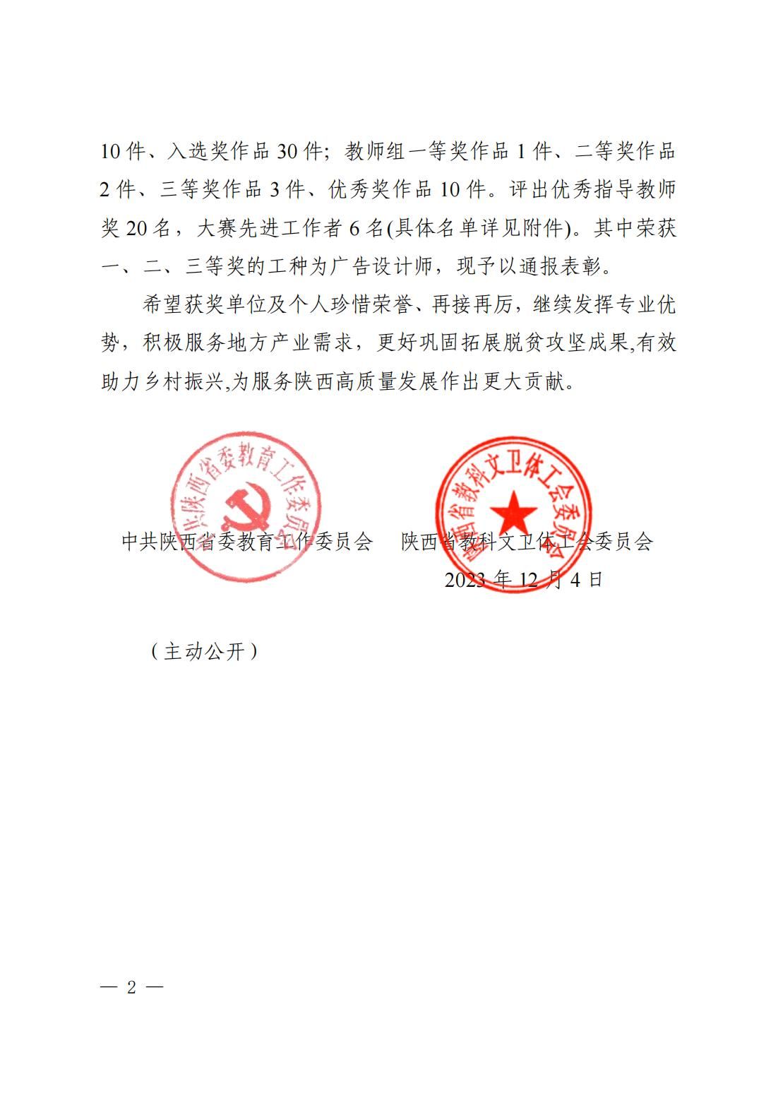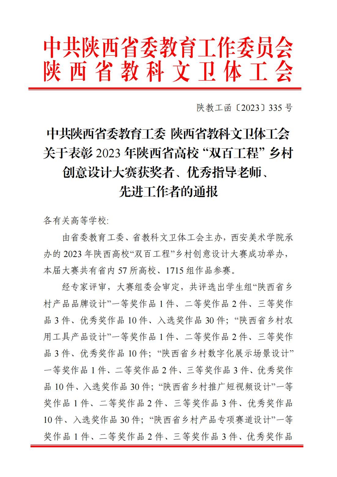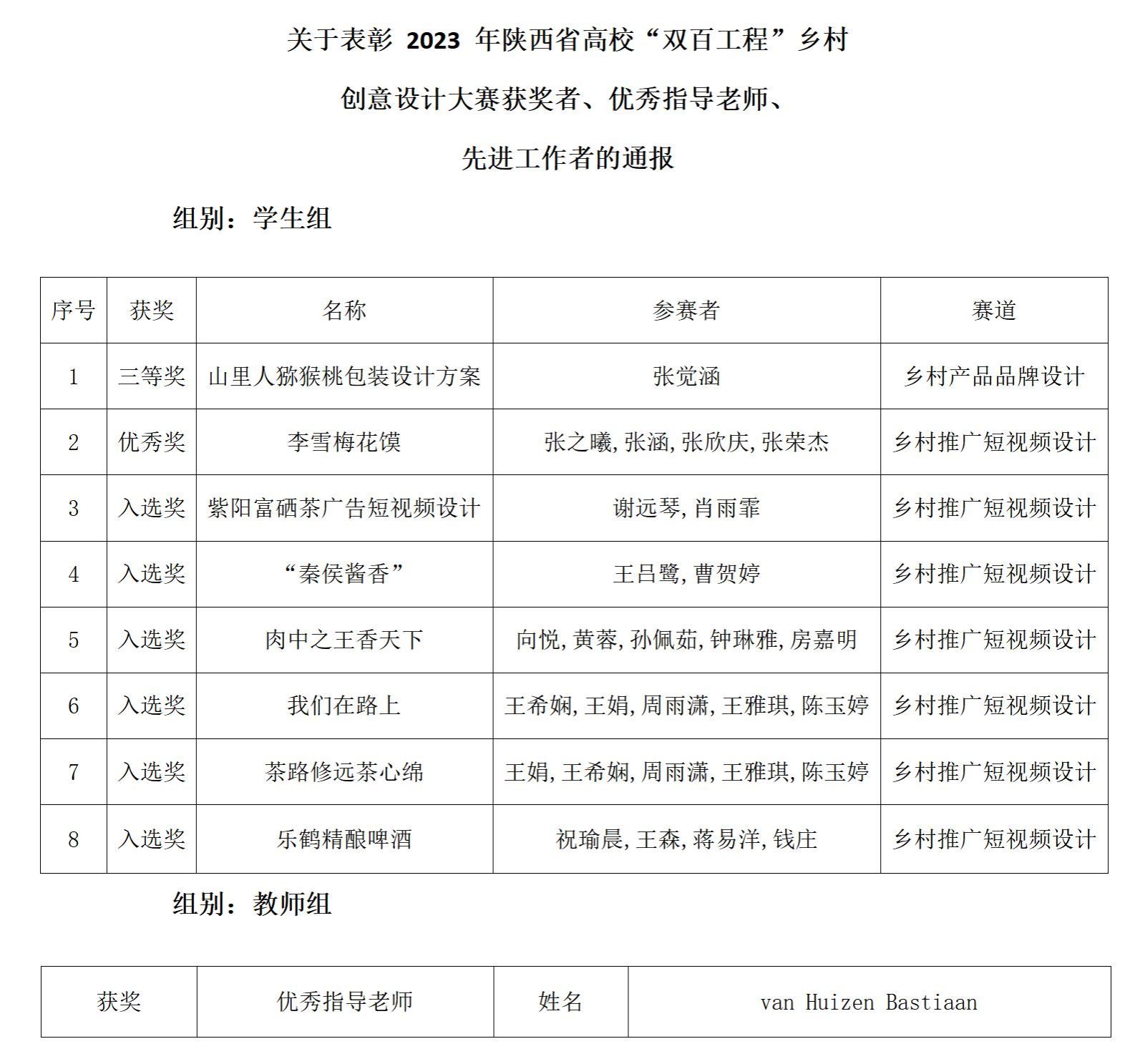 日前,中共陕西省委教育工作委员会、陕西省教科文卫体工会下发《关于表彰2023年陕西省高校“双百工程”乡村创意设计大赛获奖者、优秀指导老师、先进工作者的通报》,beat365教师van Huizen Bastiaan荣获“优秀指导教师奖”,学生作品共获得大赛“陕西省乡村产品品牌设计”赛道三等奖1项、“乡村推广短视频设计”赛道优秀奖1项、入选奖6项。