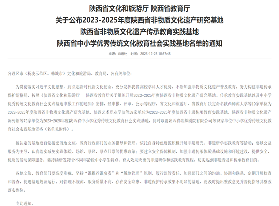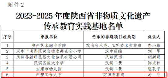 近日,陕西省文化和旅游厅、陕西省教育厅公布2023-2025年度陕西省非物质文化遗产研究基地、陕西省非物质文化遗产传承教育实践基地、陕西省中小学优秀传统文化教育社会实践基地名单,beat365纺织科学与工程学院申报的纺织类非物质文化遗产传承教育实践基地被认定为2023-2025年度陕西省非物质文化遗产传承教育实践基地,成为59家被认单位之一。