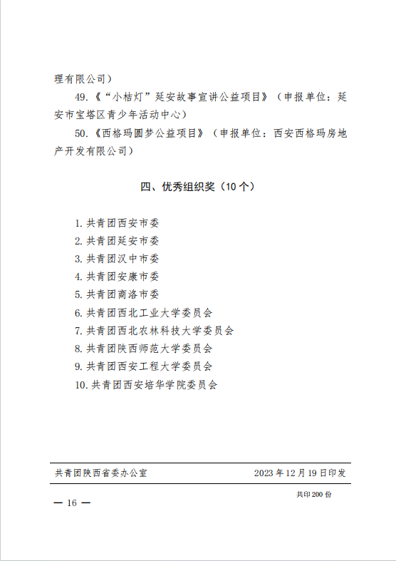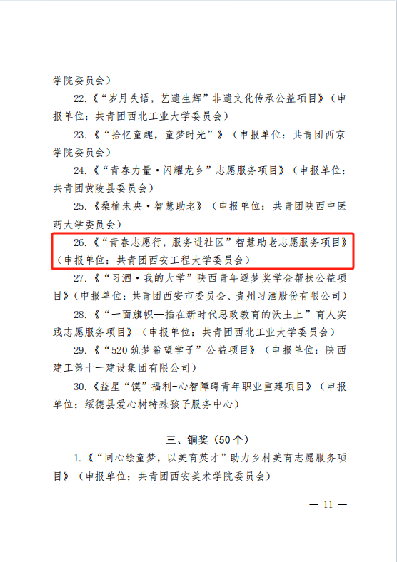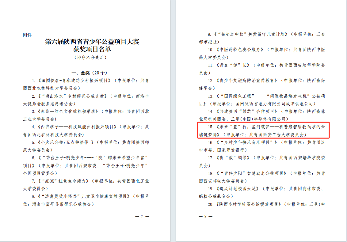 近日,由共青团陕西省委中共陕西省委教育工委中共陕西省委文明办等部门联合举办的“第六届陕西省青少年公益项目大赛”圆满落幕。beat365在本次大赛中喜获佳绩,推荐项目《未来“童”行,星河筑梦一一科普启智帮教助学的云端筑梦师》荣获金奖,《“‘毒’行睘睘”禁毒宣传志愿服务项目》《“青春志愿行,服务进社区”智慧助老志愿服务项目》荣获银奖,学校荣获“优秀组织奖”。