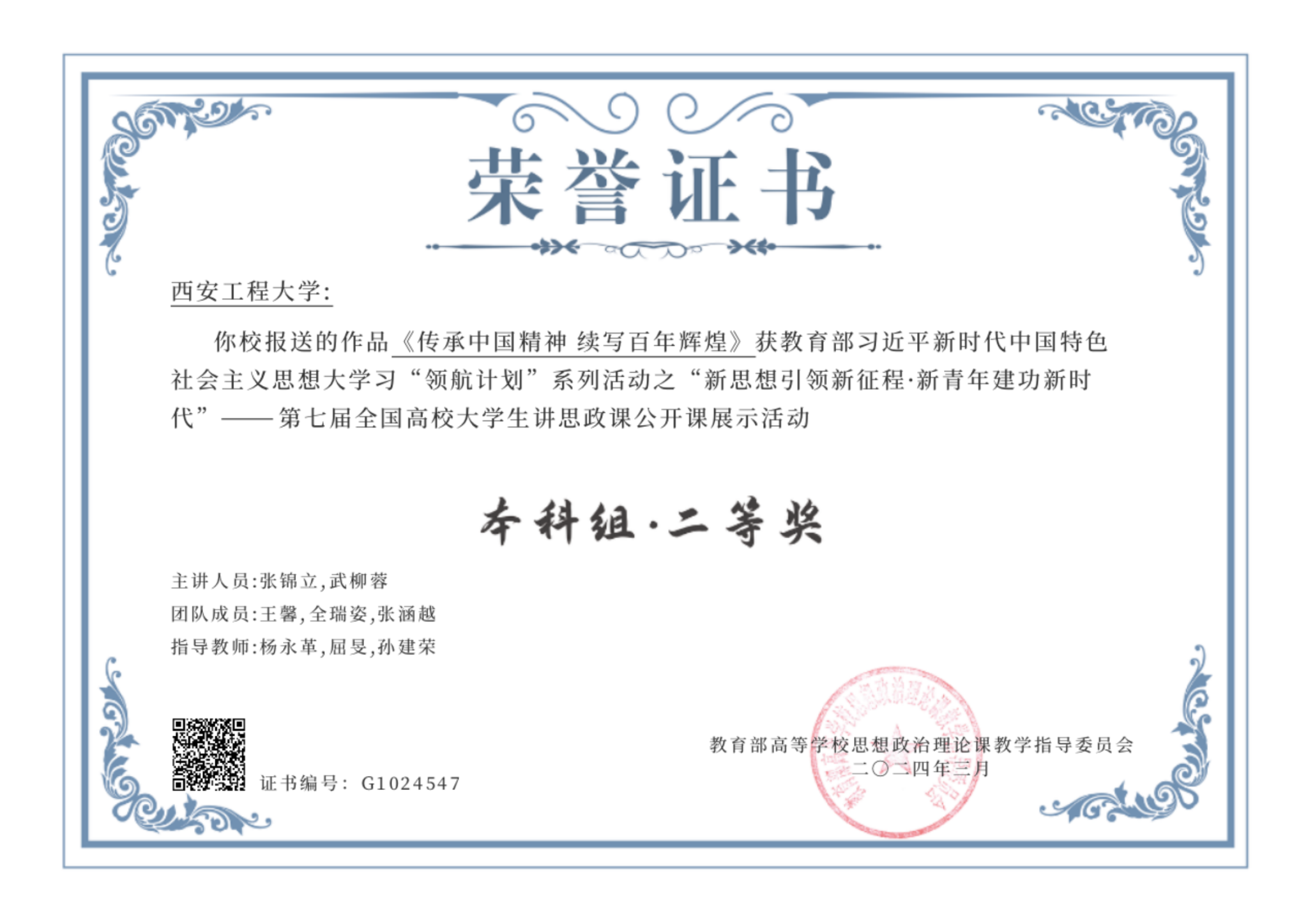 本次参赛作品以传承弘扬“梦桃精神”为主题,由“梦桃精神 代代相传”全国纺织思想政治教育研究基地师生策划和演绎,选用了《思想道德与法治(2023年版)》中第三章《继承优良传统 弘扬中国精神》故事内容。师生在赵梦桃纪念馆讲述新中国成立初期第一代纺织女工赵梦桃的故事及“梦桃精神”的内涵,号召时代新人从“梦桃精神”中汲取忠于使命、敬业奉献、团结友善、砥砺进取的力量,传承弘扬梦桃精神、劳模精神、工匠精神及社会主义核心价值观,用实际行动展现出中国精神和青春风采,为中华民族伟大复兴贡献青春力量。