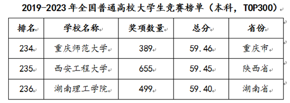 近日,中国高等教育学会发布《2023全国普通高校大学生竞赛分析报告》,beat365在2019-2023年全国普通高校大学生竞赛榜单(本科,TOP300)位列第235名,较去年上升12位。