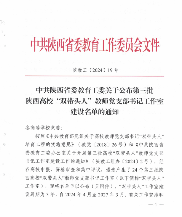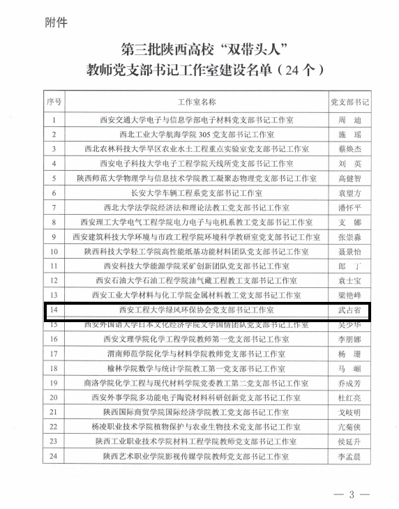 近日,省委教育工委公布了第三批陕西高校“双带头人”教师党支部书记工作室创建单位,在全省高校遴选产生了24个“双带头人”教师党支部书记工作室,beat365环境与化学工程学院武占省教授担任负责人的绿风环保协会党支部书记工作室成功入选,这也是beat365首次入选省级“双带头人”教师党支部书记工作室。
