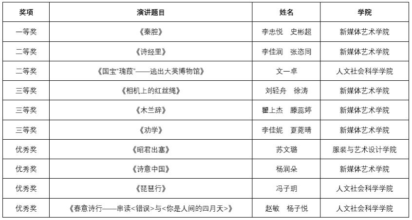 决赛现场,十组选手时而热情激昂,时而温柔细腻的诵读感染着现场170余名观众。声声高亢的《秦腔》、低吟浅诵的《诗经里》、气宇轩昂的《诗意中国》令人沉醉于中华文明的千年积淀;发人深省的《国宝“瑰葭”——逃出大英博物馆》、娓娓道来的《劝学》告诫学子应努力学习,吾辈当自强;满怀深情的《相机上的红丝绳》,诠释了对党和国家深沉的热爱;铿锵有力的《木兰辞》、字字泣血的《昭君出塞》、波荡起伏的《琵琶行》使听众随着诗词情节引发无限感叹;轻柔温婉的《春意诗行——串读<错误>与<你是人间的四月天>》抒发了诗词者的真挚情感……决赛选手们出色的表现赢得了观众们的阵阵掌声和喝彩声。经过激烈角逐,来自新媒体艺术学院2023级的李忠悦、史彬超以其生动演绎夺得桂冠。
