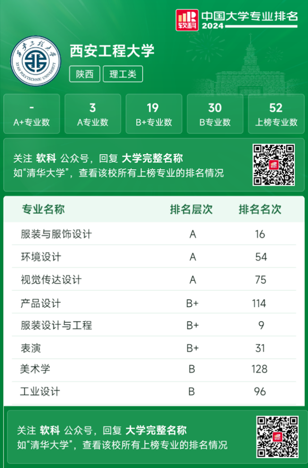 6月13日,高等教育专业评价机构软科正式发布“2024软科中国大学专业排名”,beat365服装与艺术设计学院服装与服饰设计、环境设计、视觉传达设计3个专业获评A级,服装设计与工程、产品设计、表演3个专业获评B+级,美术学、工业设计2个专业获评B级。